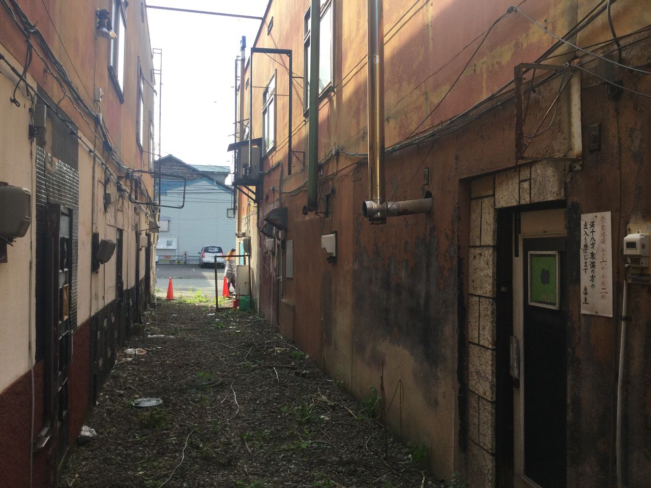 コの字型をした袋小路の突き当たりから通りを眺めます。路面が砂利なのは最初からなのか、だとしたら凄まじい場末です。