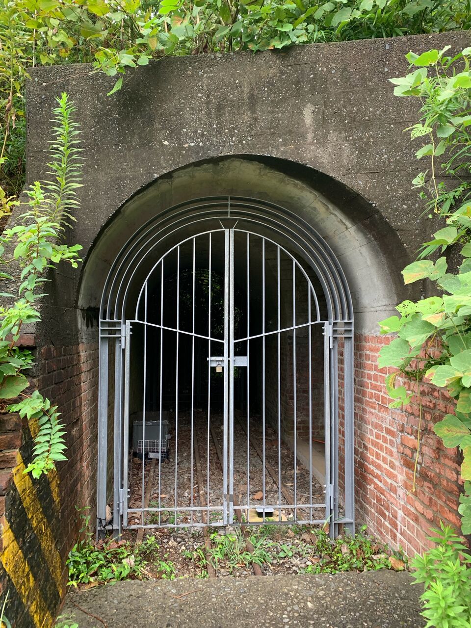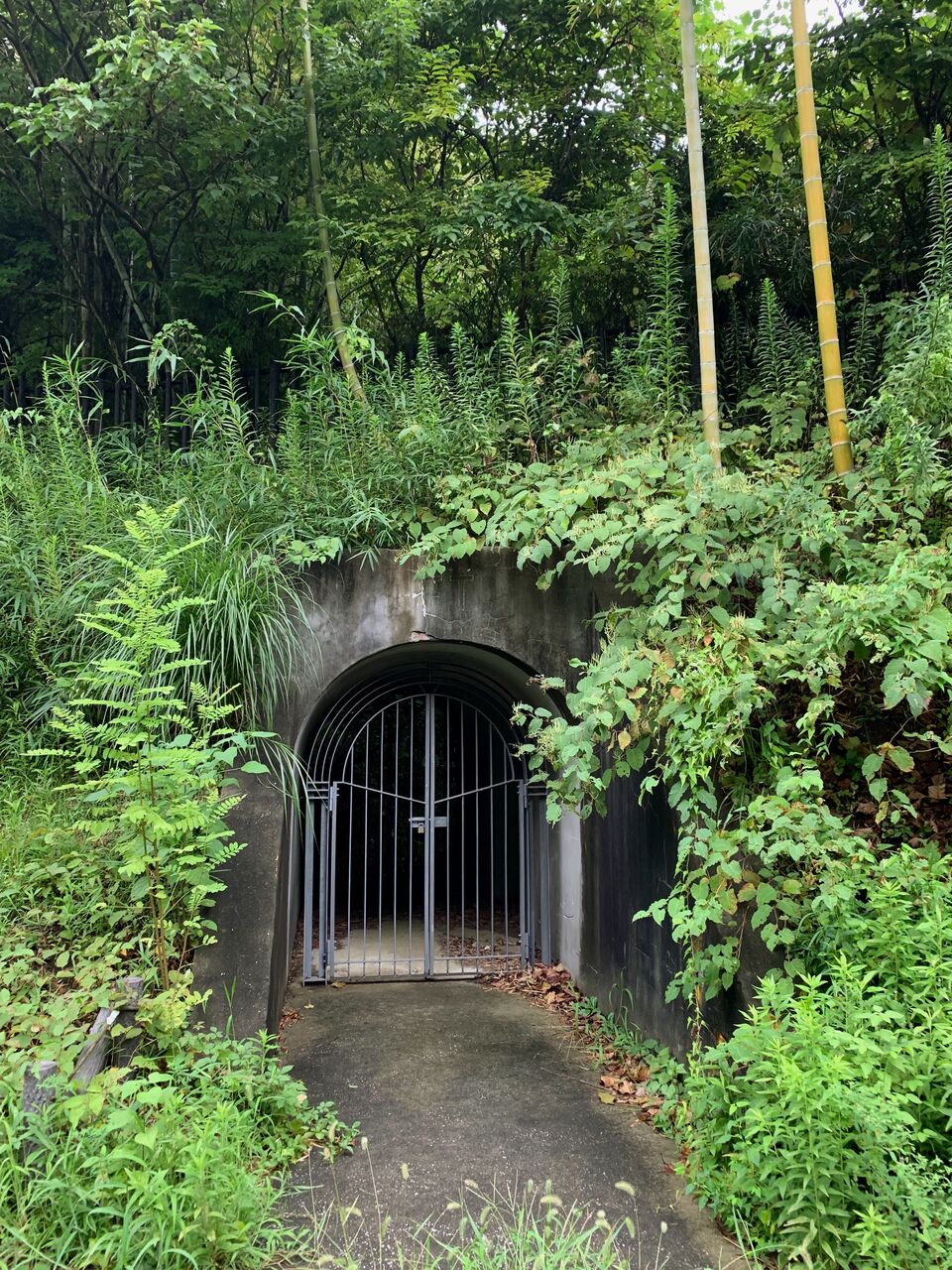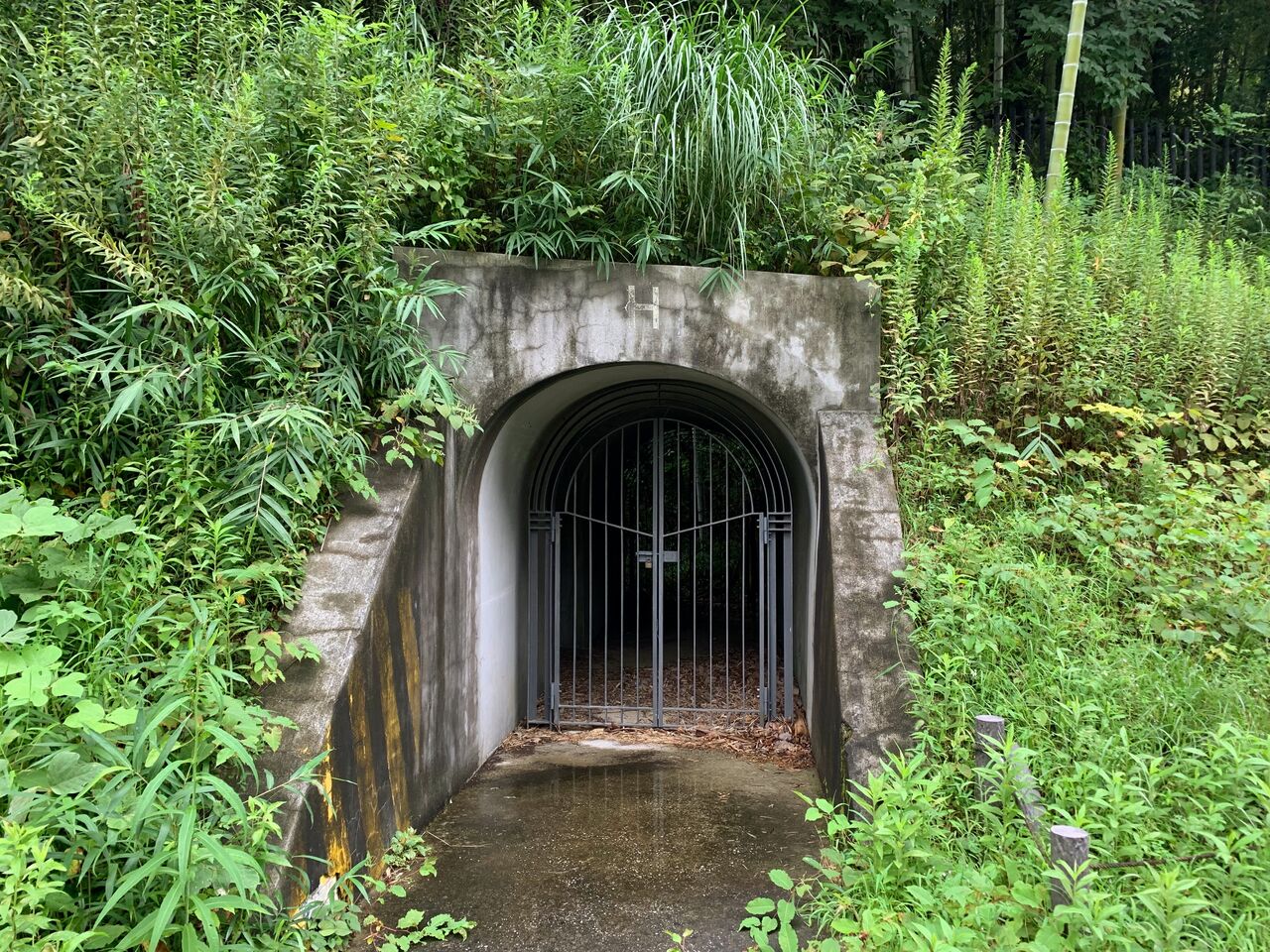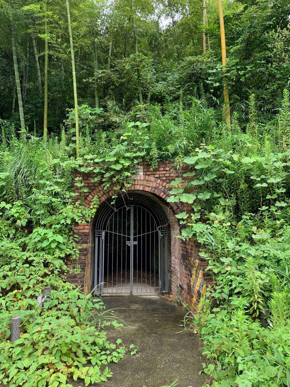 こちらも中を覗くと左手へ続くトンネルがあります。元々火薬工場はその危険性から周辺に緩衝地帯を設けなければならないと火薬取締法で定められています。そのため広大な敷地は原生林に囲まれており、ホタルも生息しているとか。ちょうどそのホタル生息地の方で草刈り作業が行われていました。