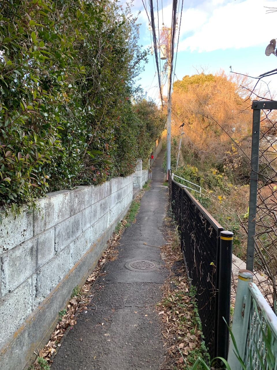 崖地の狭い歩道。Googleマップでは道が途切れてますが実際は続いてます。もしかしたら下まで降りられるかも知れない。