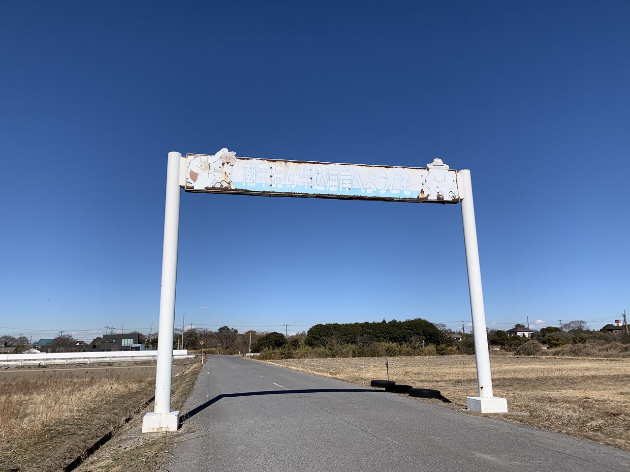 海が近くなって来ました。「潮干狩りの牛込海岸へようこそ」の看板。今年の観光潮干狩りは3月15日からだそうです。