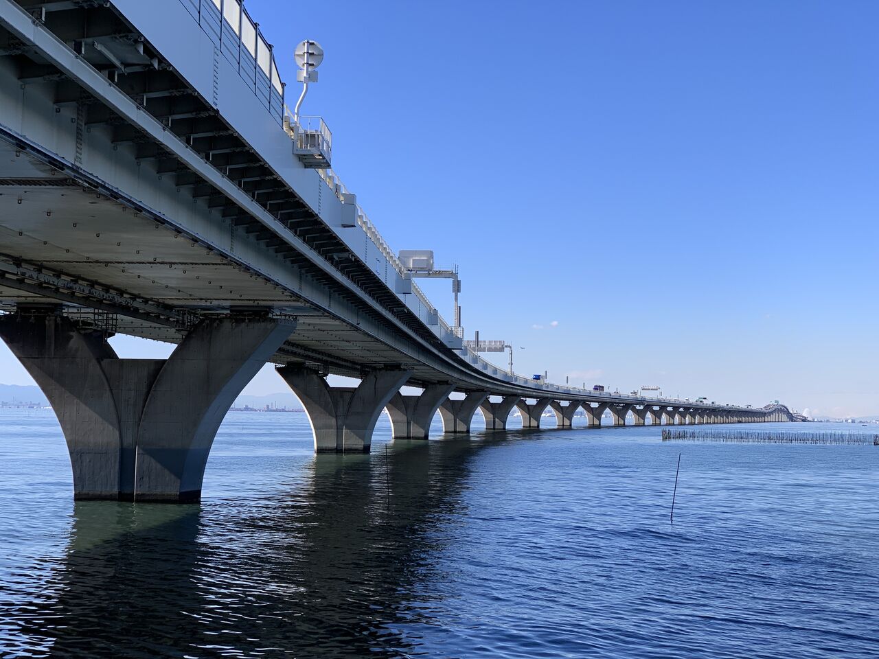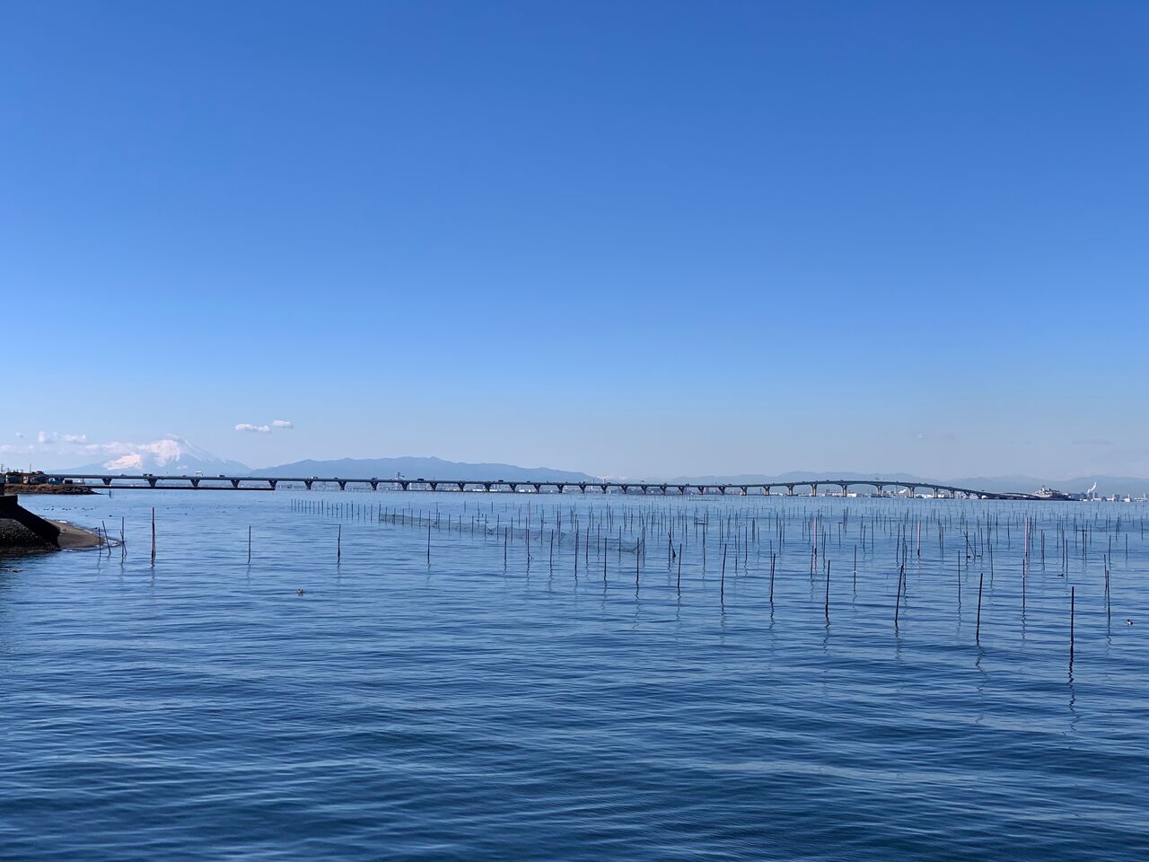 海沿いの漁村はアサリ漁と海苔の養殖を生業としています。海苔の養殖棚の向こうにはアクアライン。左端には富士山も望めています。