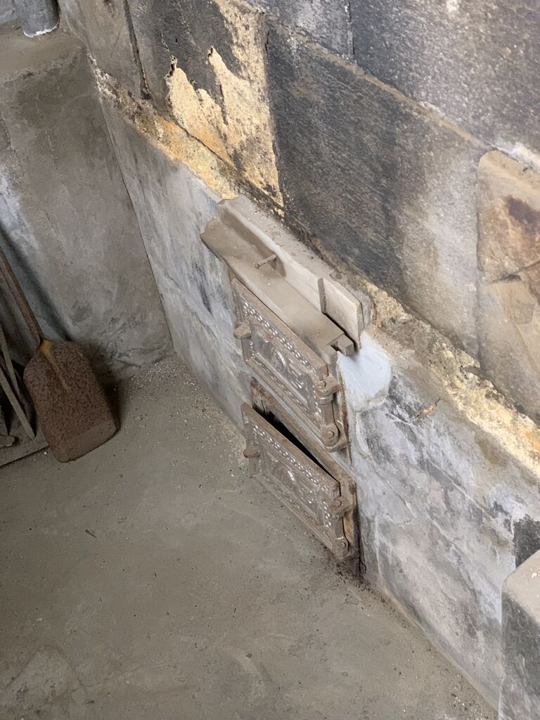 薪を焚べるいわゆるコンロ。上には換気口もあり、現在のキッチンの原型を見ているようです。建物は今でも将棋の会場や様々なイベント等で利用されているため、上にガスコンロが乗せられています。