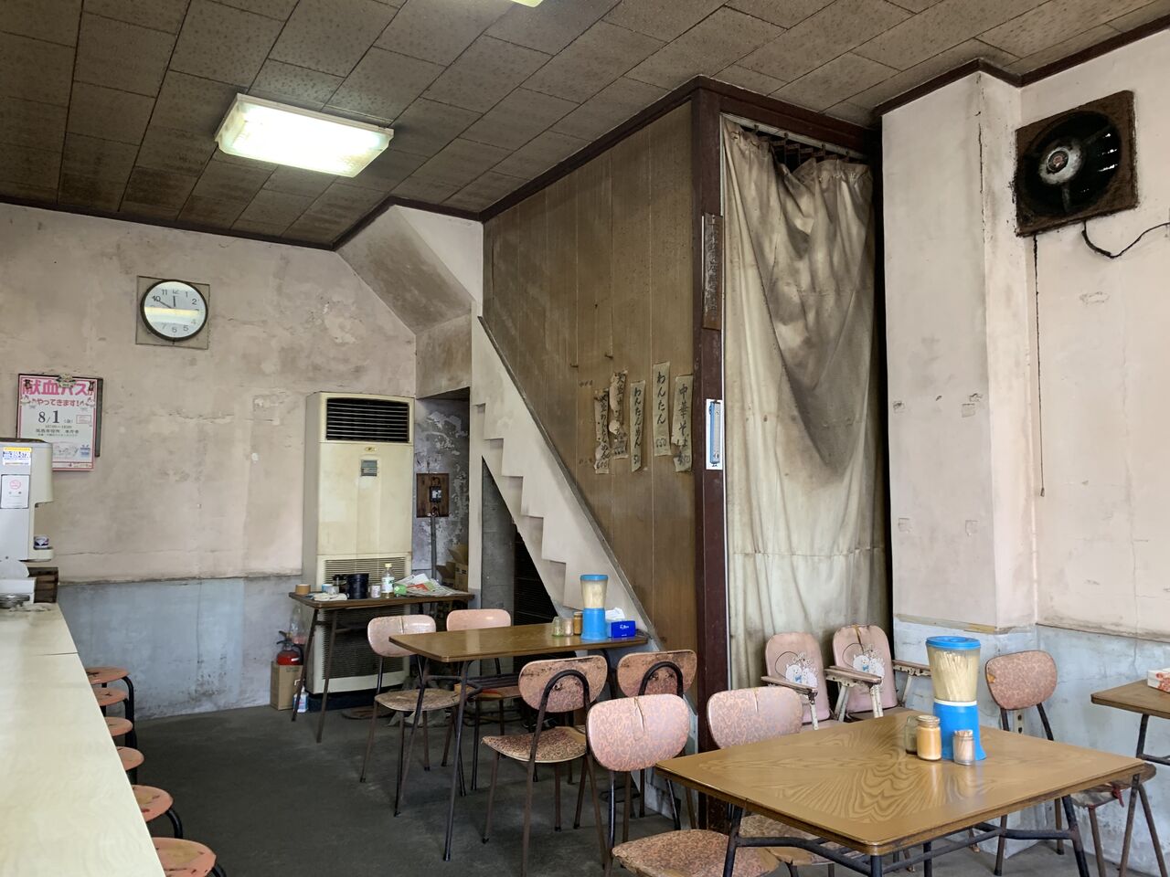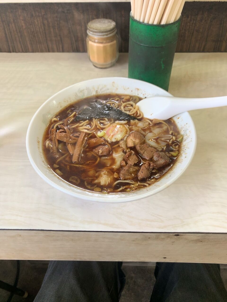 メニューはラーメン450円とワンタン麺500円、あと大盛りのみ。広い店内ですが、かつては2階にお座敷もあったのかも。