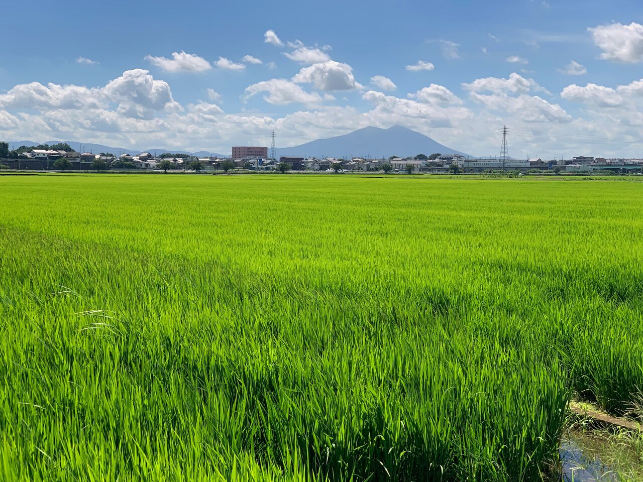 市街地を抜けると広大な水田地帯が広がります。用水路の水が溢れんばかりで、遠くには筑波山の山陵。
