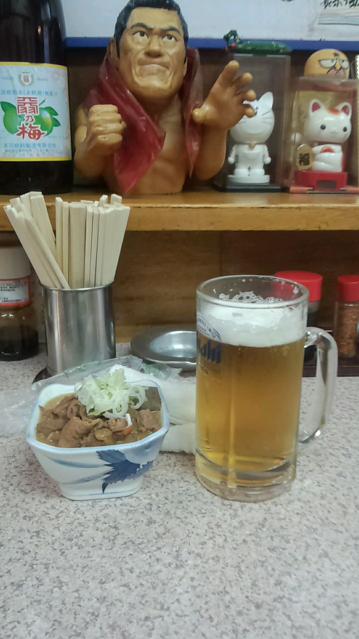 なぜか猪木。生ビール500円、割り物280円~、串物100円~、煮込み360円。地元の方々でほぼ満席となる人気店で、いかにも下町の大衆居酒屋といった雰囲気で落ち着きました。