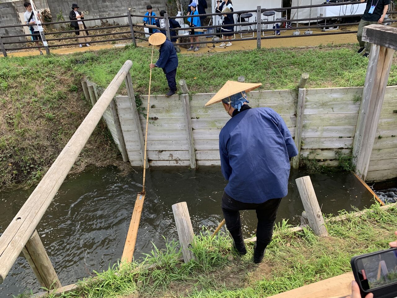 しかし船が群馬県側へと近づくにつれ、みるみる水深が浅くなって行きます。これは近年の台風や豪雨によって上流から流されて来た土砂がカーブの外側に当たる群馬県側に堆積した物。水深50センチほどでしょうか全然立てる程に浅く、船底が擦るギリギリの所なんじゃないでしょうか。
