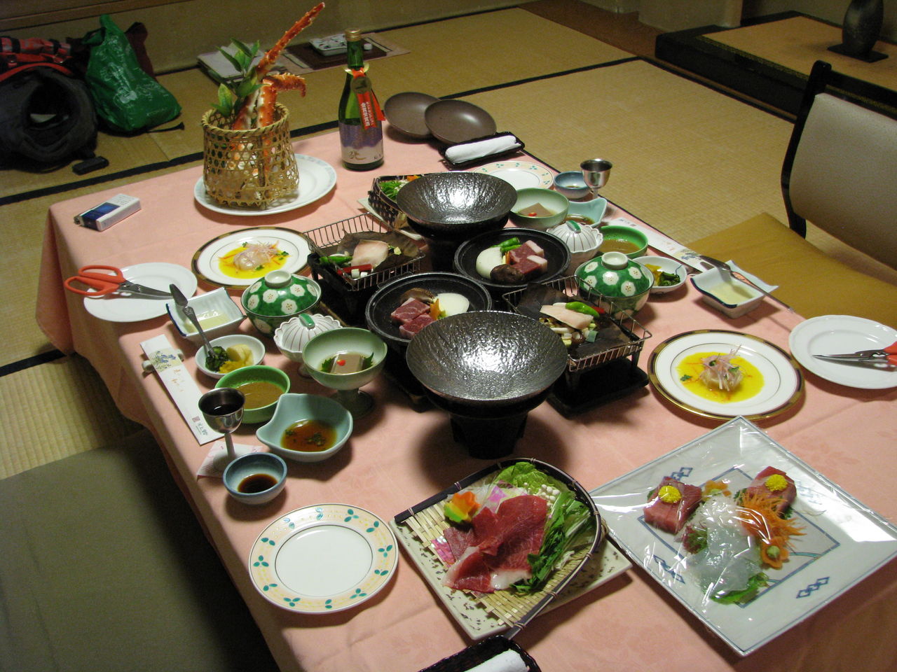 素泊まり4500円で泊まったため、一泊目の夜食は居酒屋で。米屋旅館さんの親戚が経営する『魚信』さん。新鮮な馬刺や温泉水で炊いた湯豆腐が美味しい。またサービスで出して下さったキュウリの浅漬けとイチゴがやたら美味! 良いお店です。