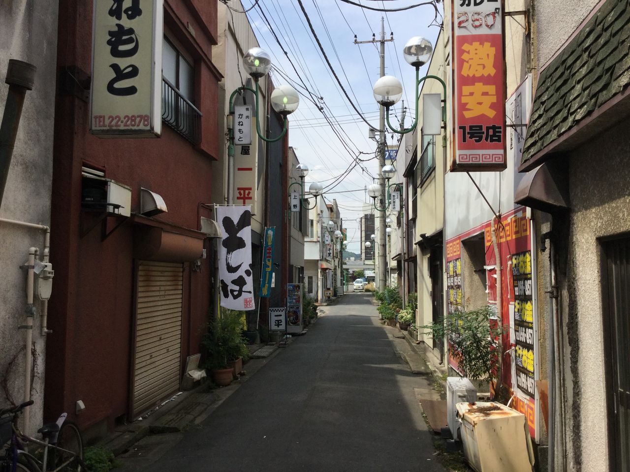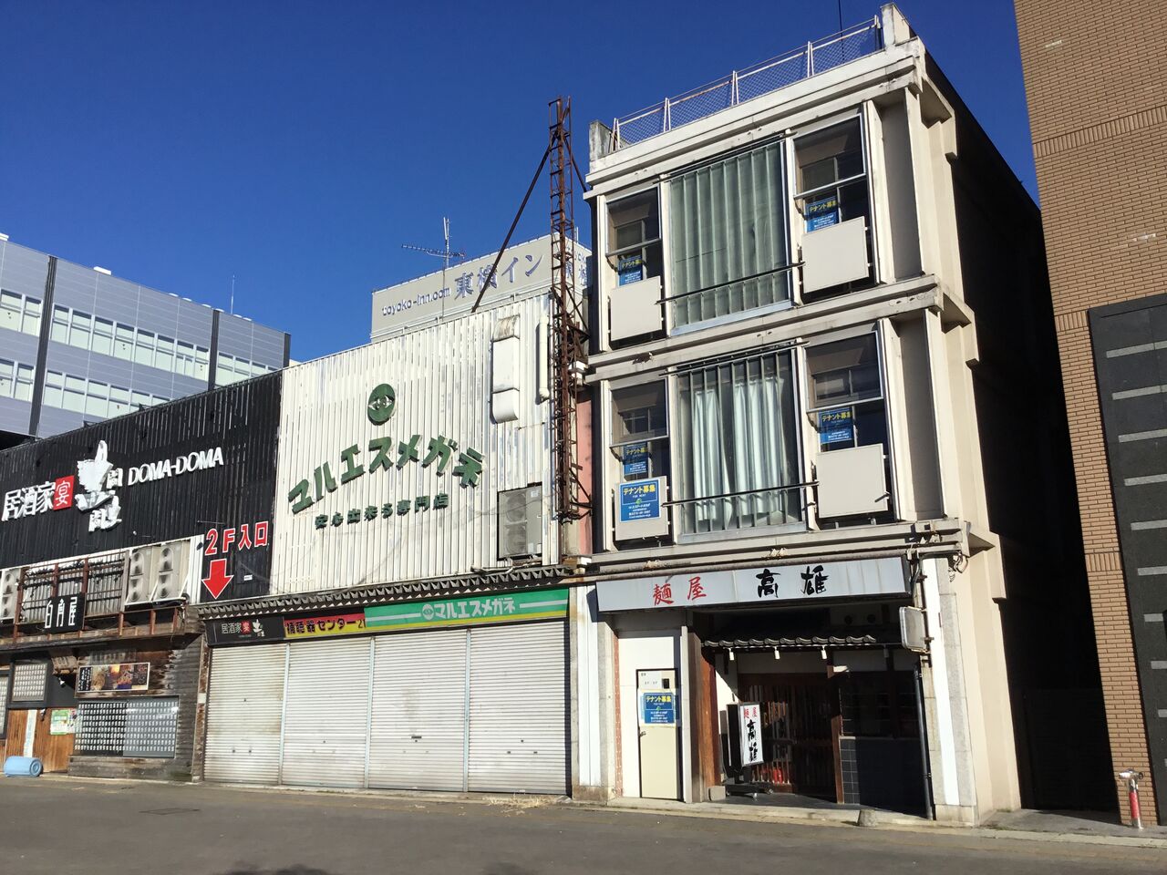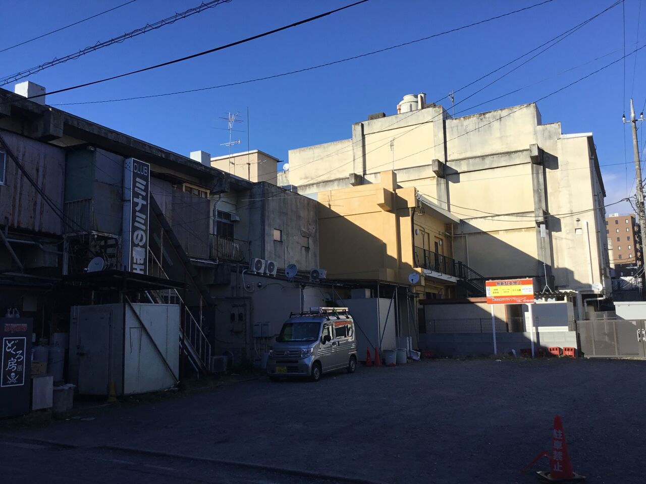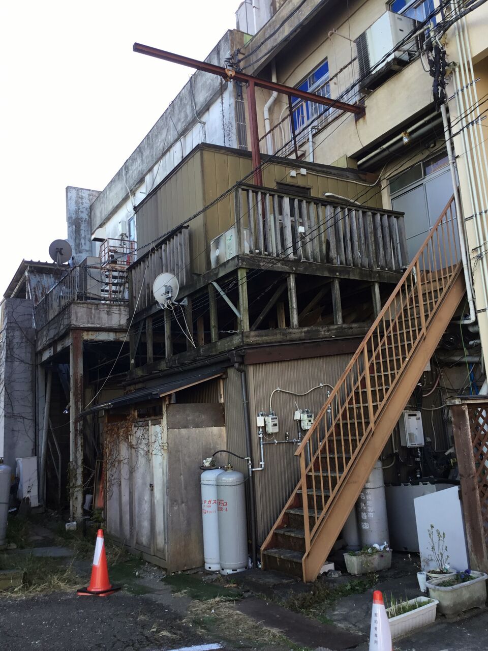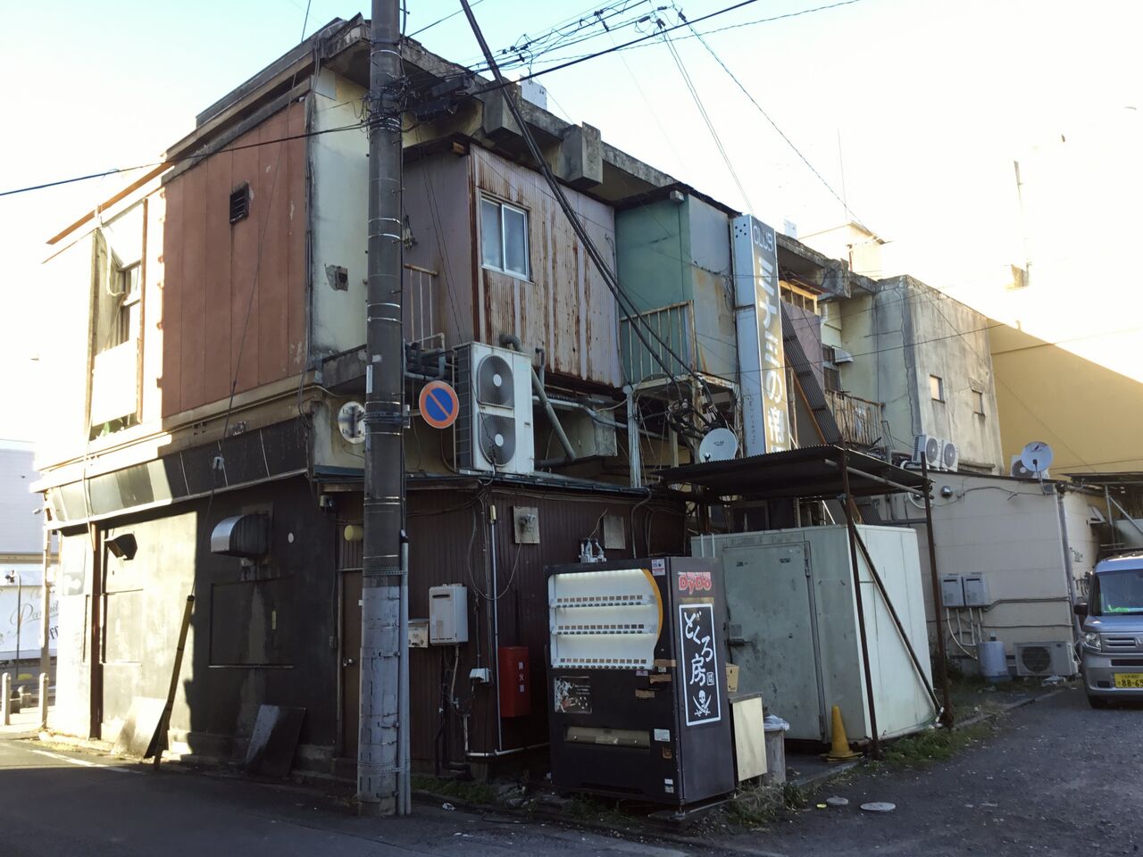 2階建から3階建のビルが建ち並んでいますが、みな同じ造りをしています。恐らく長屋のような造りで同じ年代に建った物かと思われます。見た感じ昭和30〜40年代でしょうか、一度再開発がされたようです。