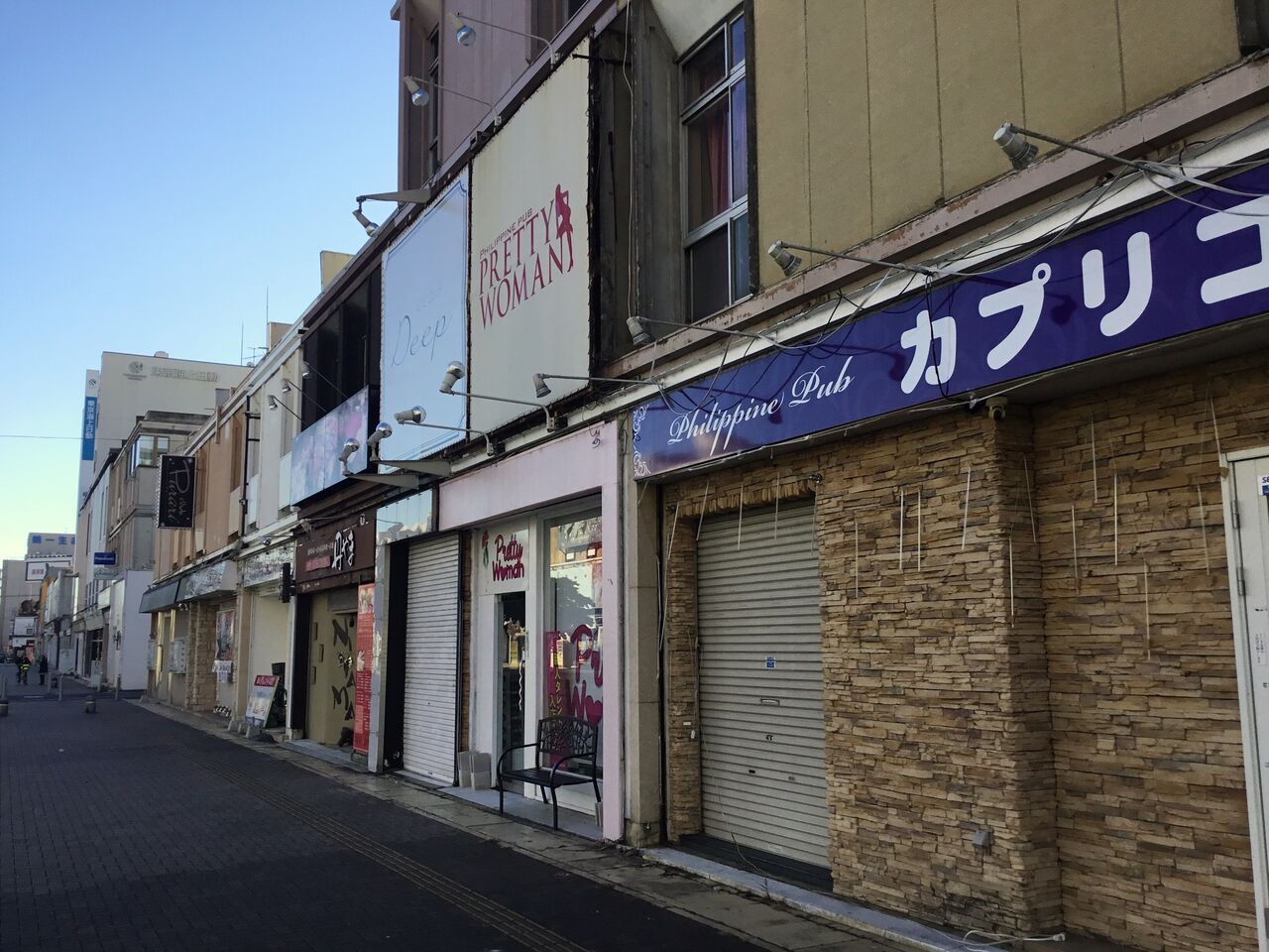 特に多いのがフィリピンパブ。思うのですが、以前の大通りだった頃、路上駐車して飲みに行く人が絶えなかったから、車道を縮小したのではないかと。そもそも飲酒運転など言語道断ですが、近年やっと取り締まりが厳しくなって来たものの、地方では暗黙の了解のように飲み屋に駐車場が併設されていました。