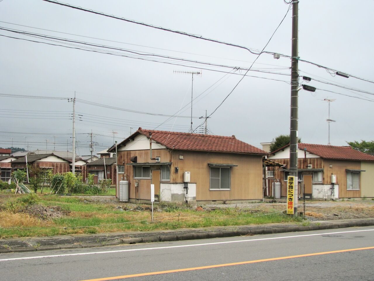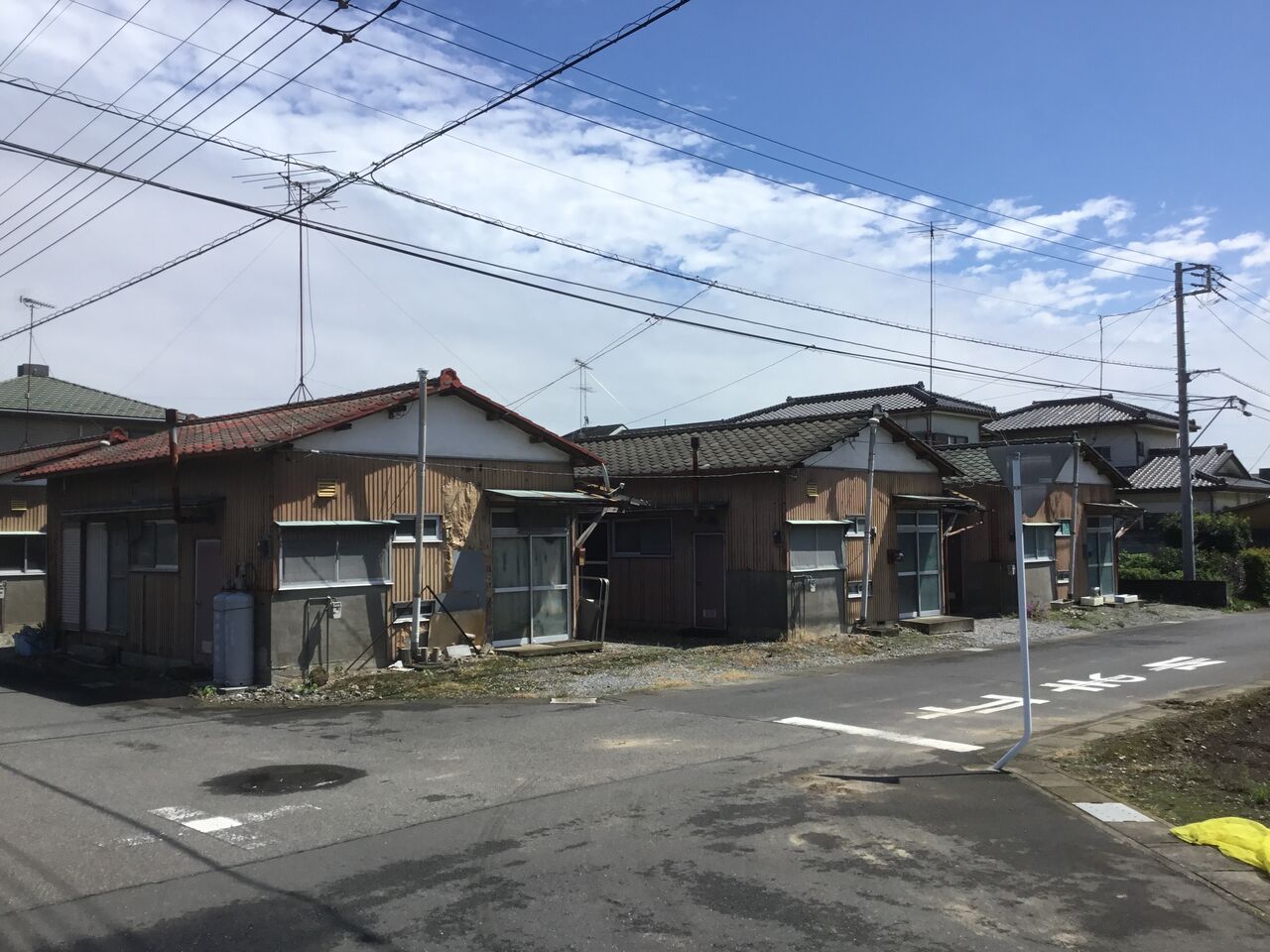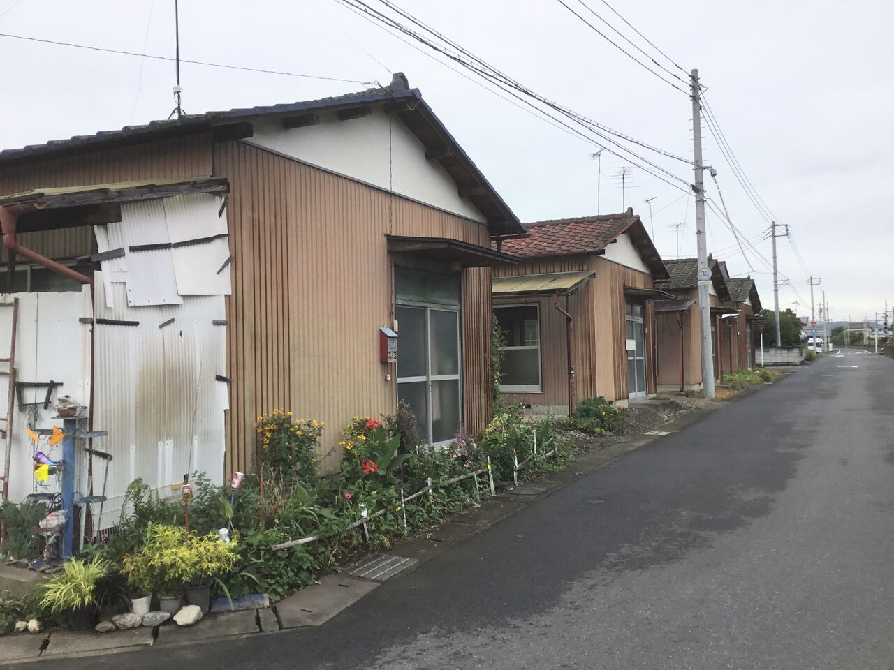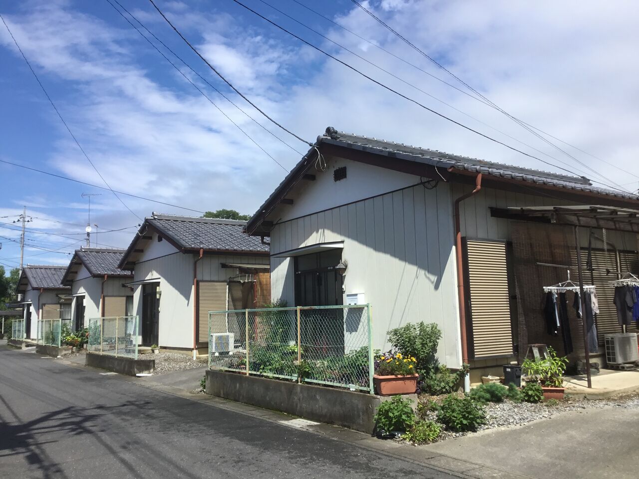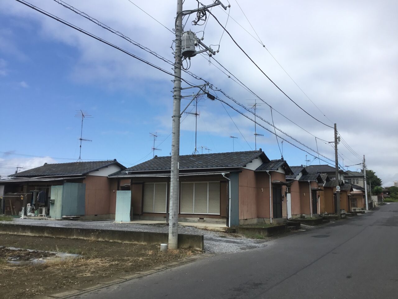 縁側どころか室内まで隣の棟の玄関から丸見えになるのは、平屋建て団地の特徴とも言えます。前々回訪れた吉水の貸家地帯も同じ時代のものと考えられる。