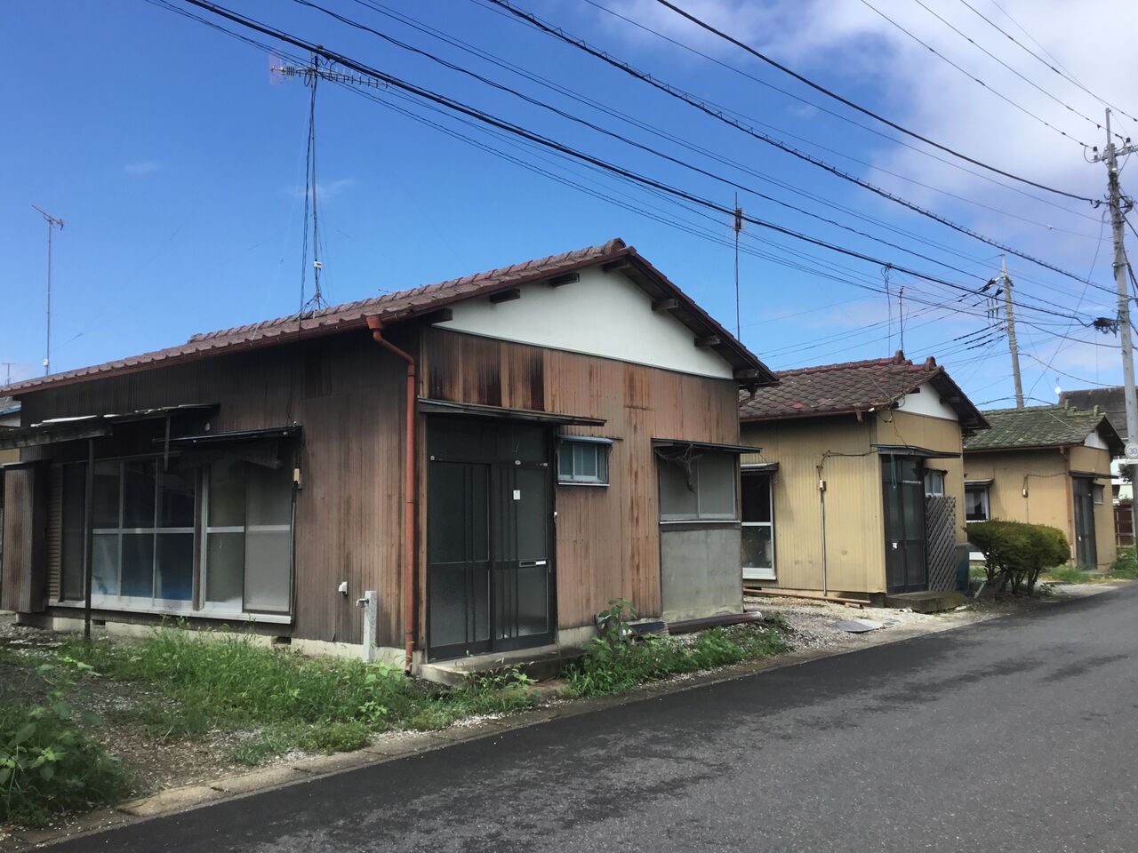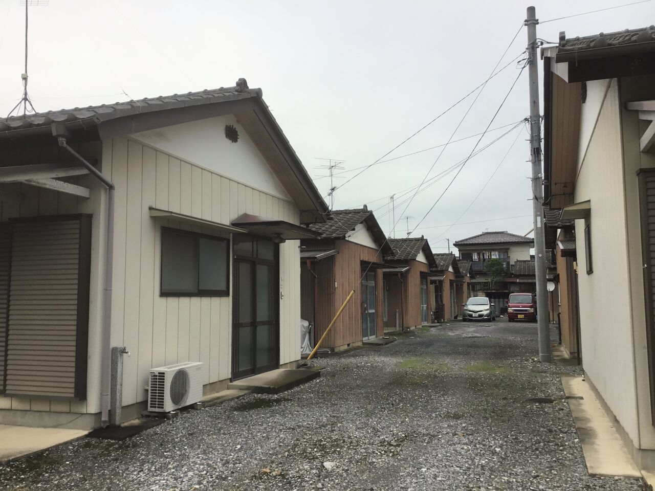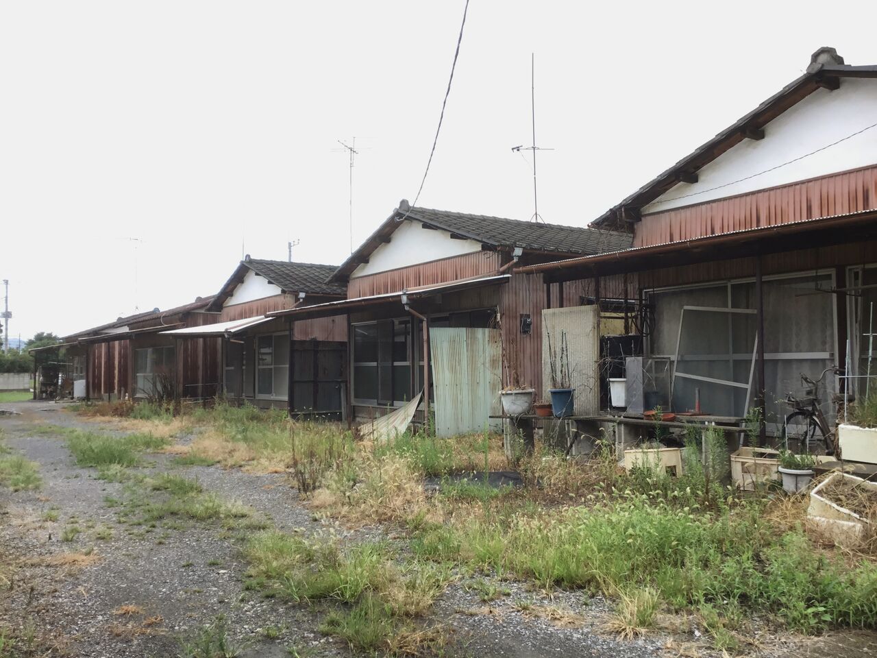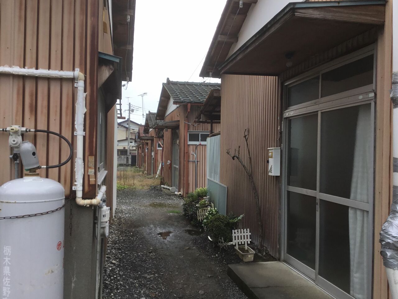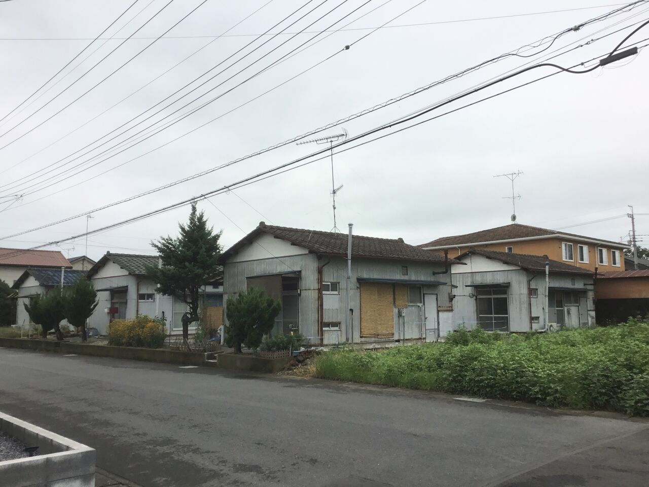縁側どころか室内まで隣の棟の玄関から丸見えになるのは、平屋建て団地の特徴とも言えます。前々回訪れた吉水の貸家地帯も同じ時代のものと考えられる。