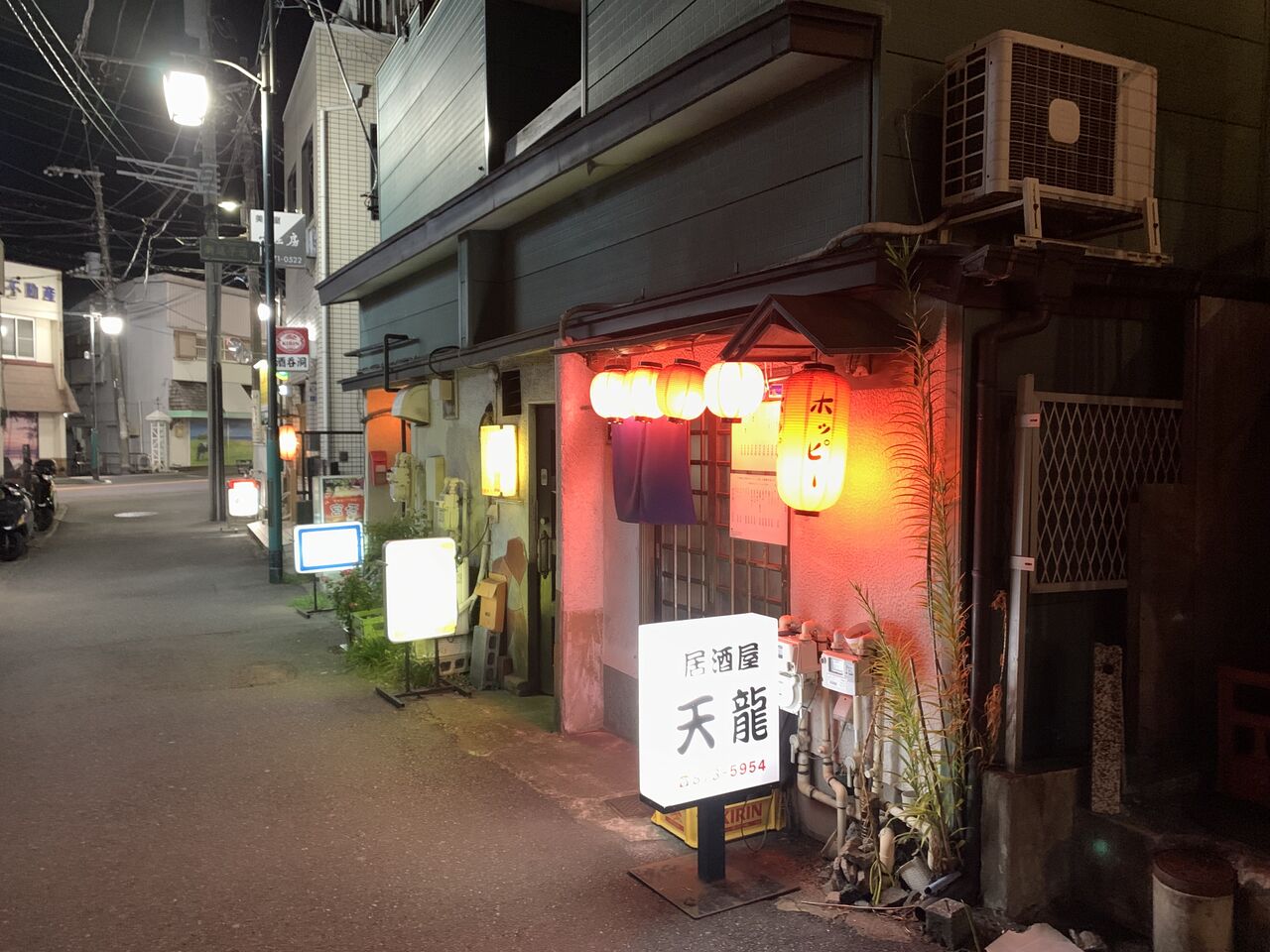 亀岡八幡宮向かいの路地裏に静かに佇む赤提灯。寄り屋さんの店頭テーブルが空いてなかったので迷い込みました。居酒屋「天龍」さん。