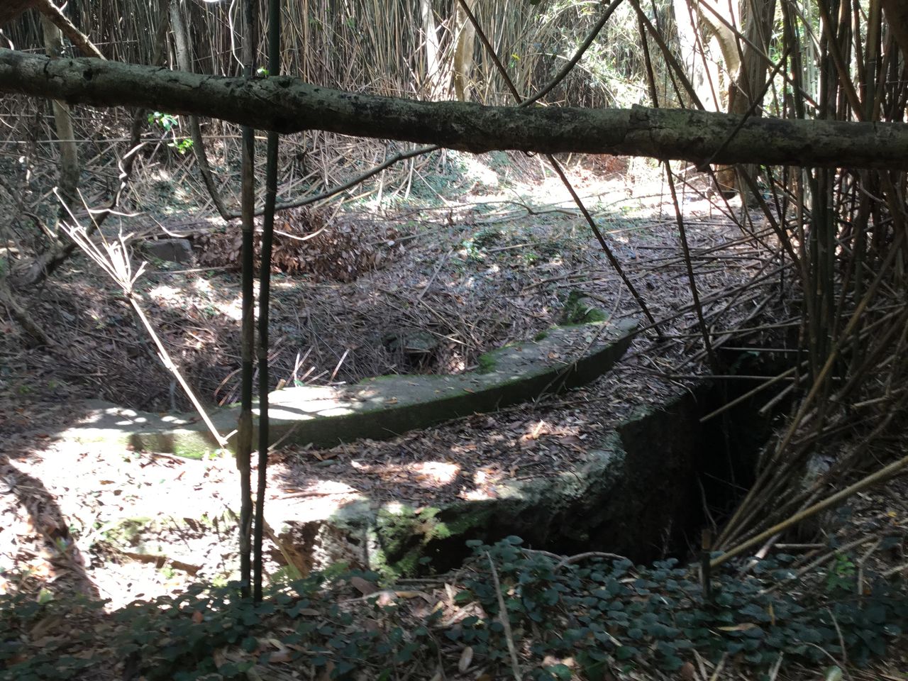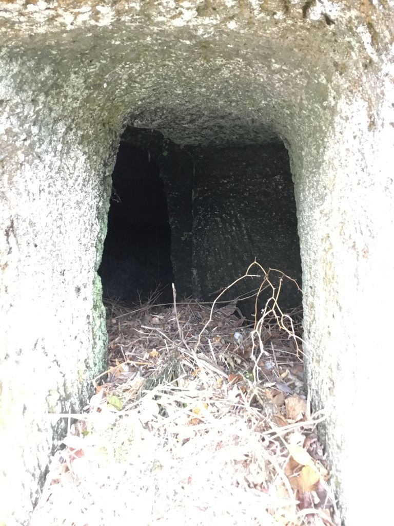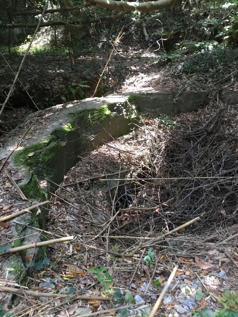 住宅の中にコンクリート造の遺構が。砲弾に火薬を装填する炸薬填実所だそうです。危険なので半地下にしてドーム状で分厚いコンクリートに覆われています。このコンクリートが堅すぎたと言う事で民家はその上に建てられていました。地元の方曰く、ついこの前も写真撮り来てたけど、飛行機の格納庫とか言ってたなぁ。いや、掩体壕はこんなに小さくないし山の中腹だし、そんなわけないでしょうが。