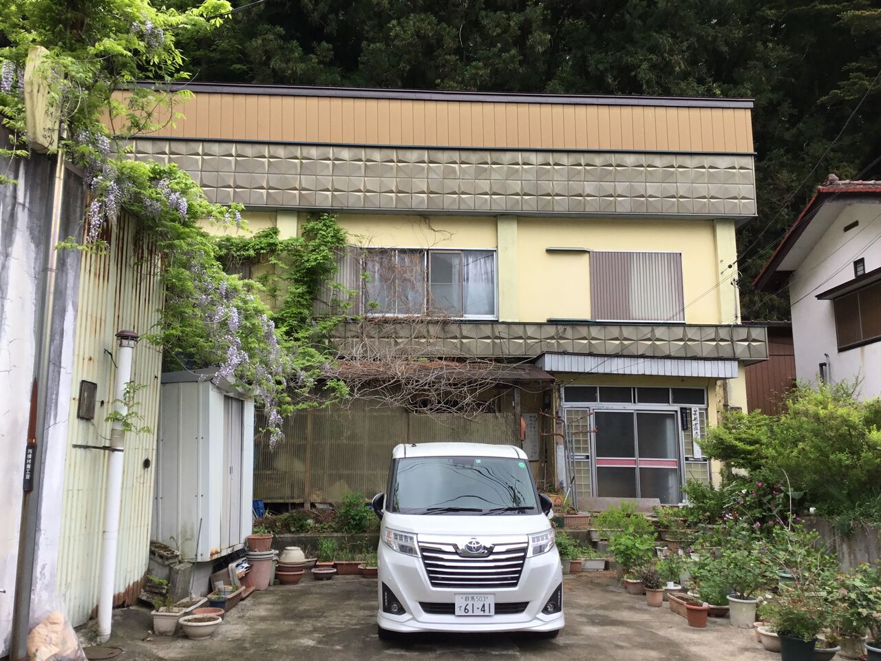 川の上流側、東老神バス停より巡っていきます。さっそくスナック廃墟のお出迎え。