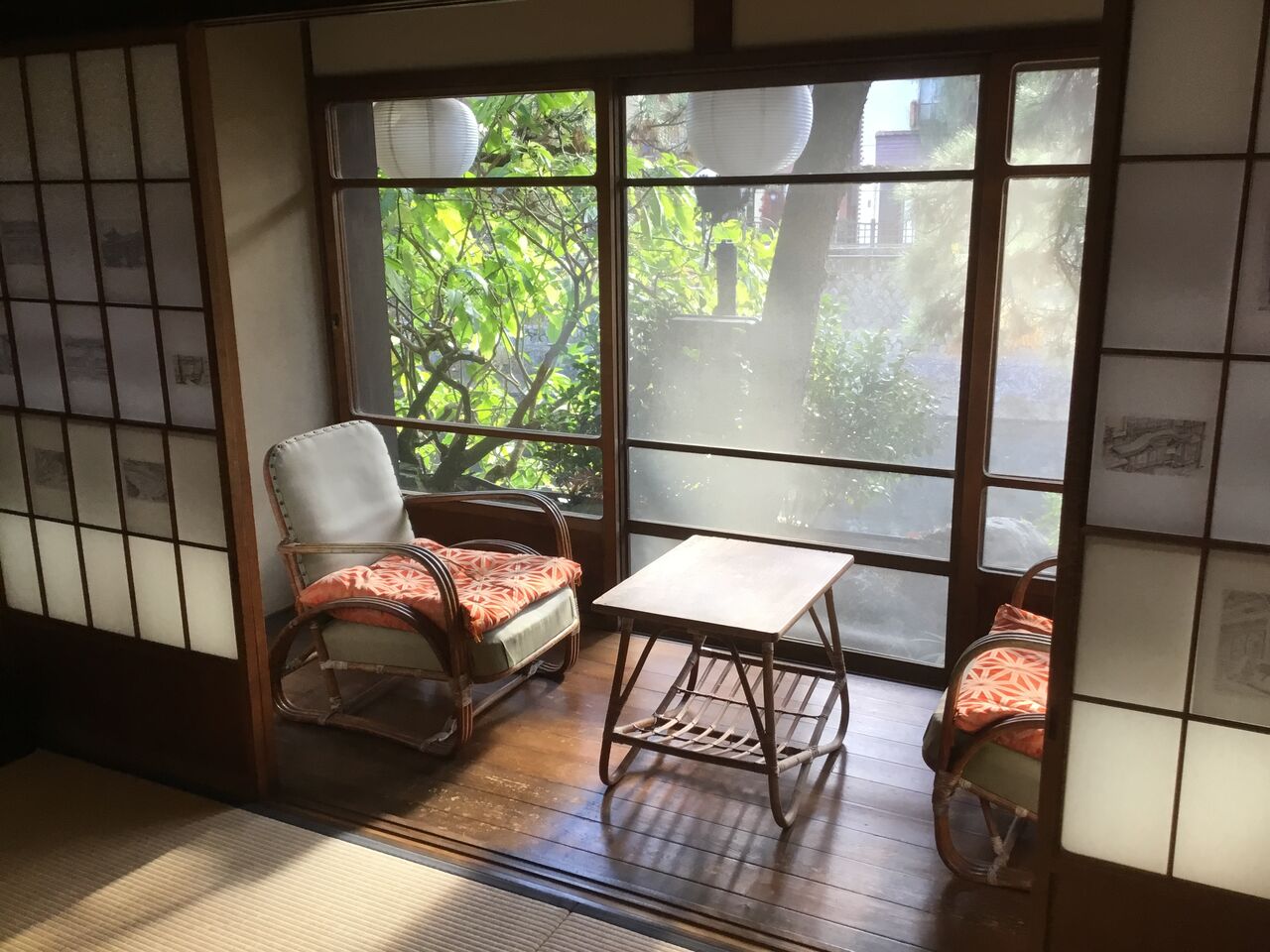 旅館営業当時の調度品は閉業当時全て譲ったり廃棄したりしてしまったそうですが、保存されてから数多くの調度品が寄贈され、旅館当時の面影を見事に再現しています。この椅子などもどこかの廃業旅館から寄贈されたのでしょうか、実に風景にマッチしています。