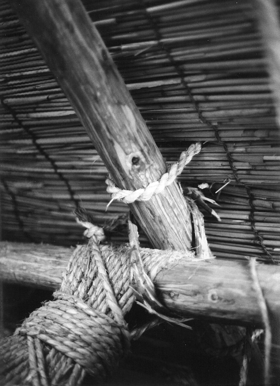 屋根の裏側で縄を受け取り、今度は内側から木の針を突き刺す。