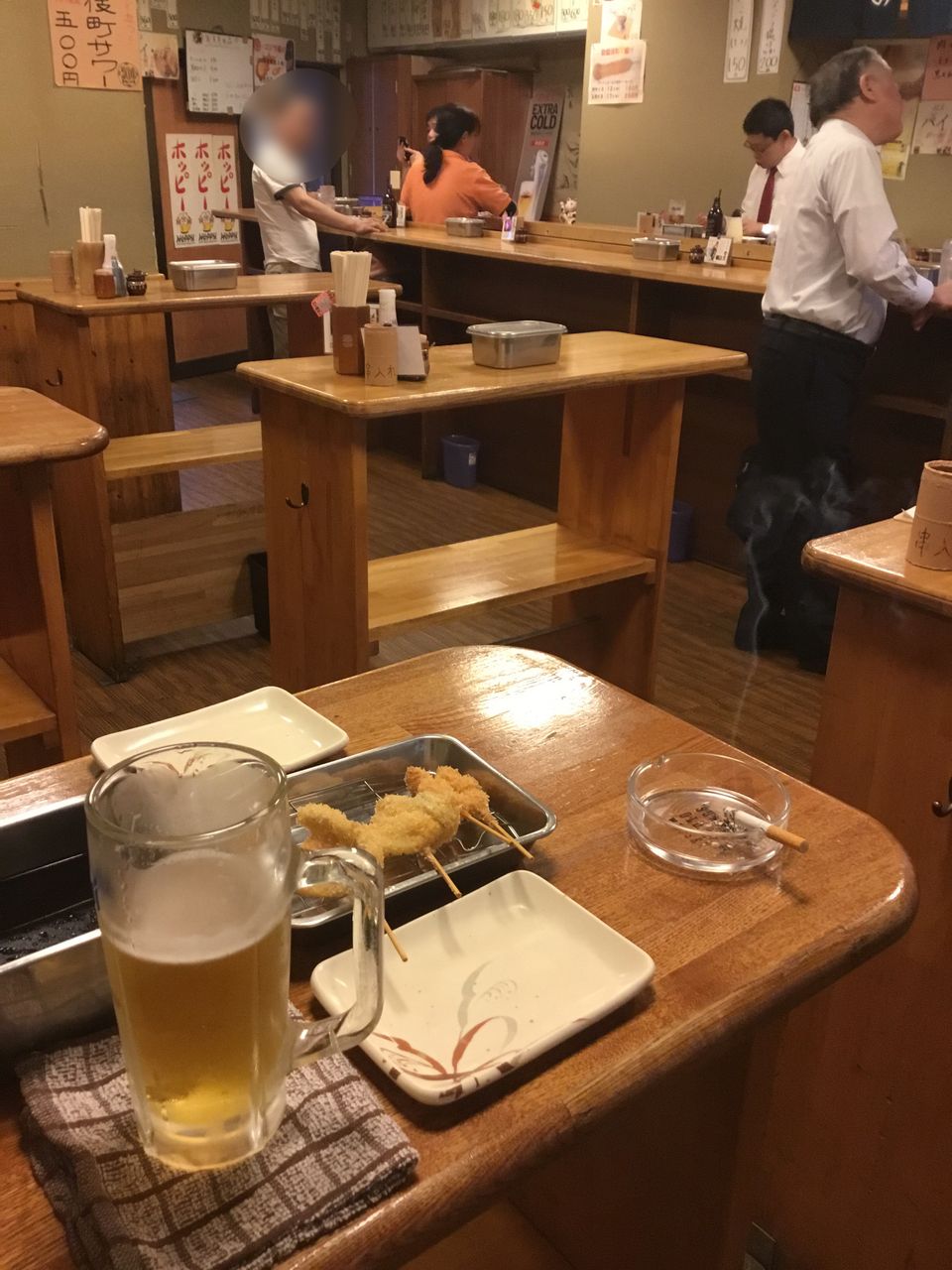 西一番街の手前、駅の真ん前右手にあるのが創業昭和31年の老舗、大衆酒場「三福」。二階は座敷ですが一階は長いカウンターが一本の細長い敷地。オッサン同士ぎゅうぎゅうに肩を並べて飲みます。店は貫通しており奥の勝手口を抜けると裏路地に出ます。