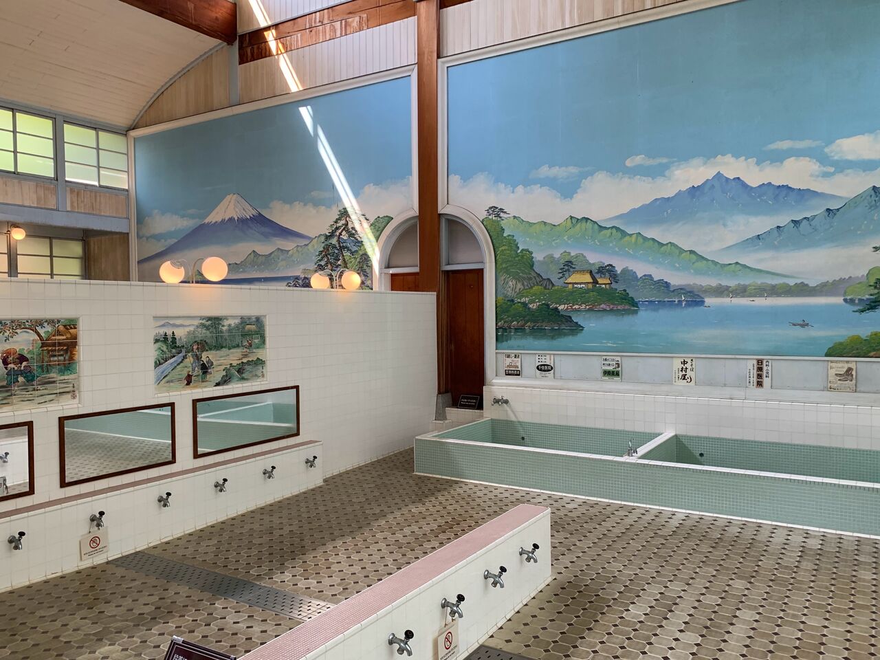 神社仏閣を思わせる大型の唐破風や脱衣所の折上格天井など、首都圏の銭湯建築は震災復興建築の特徴です。復興で大変な時期、せめてお風呂は贅沢な日本建築でと言う思いから。この銭湯建築は関西や北関東などでは見られません。