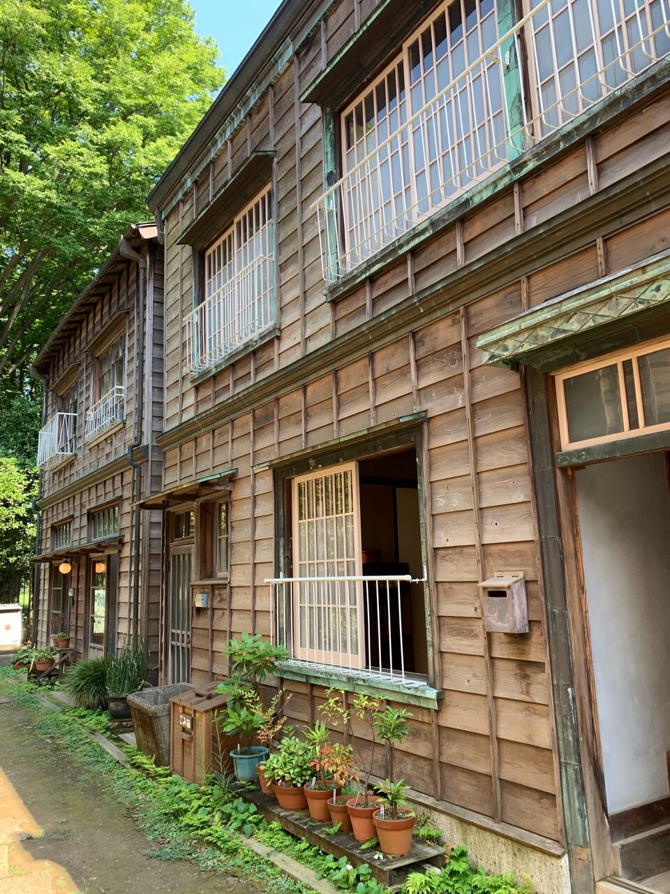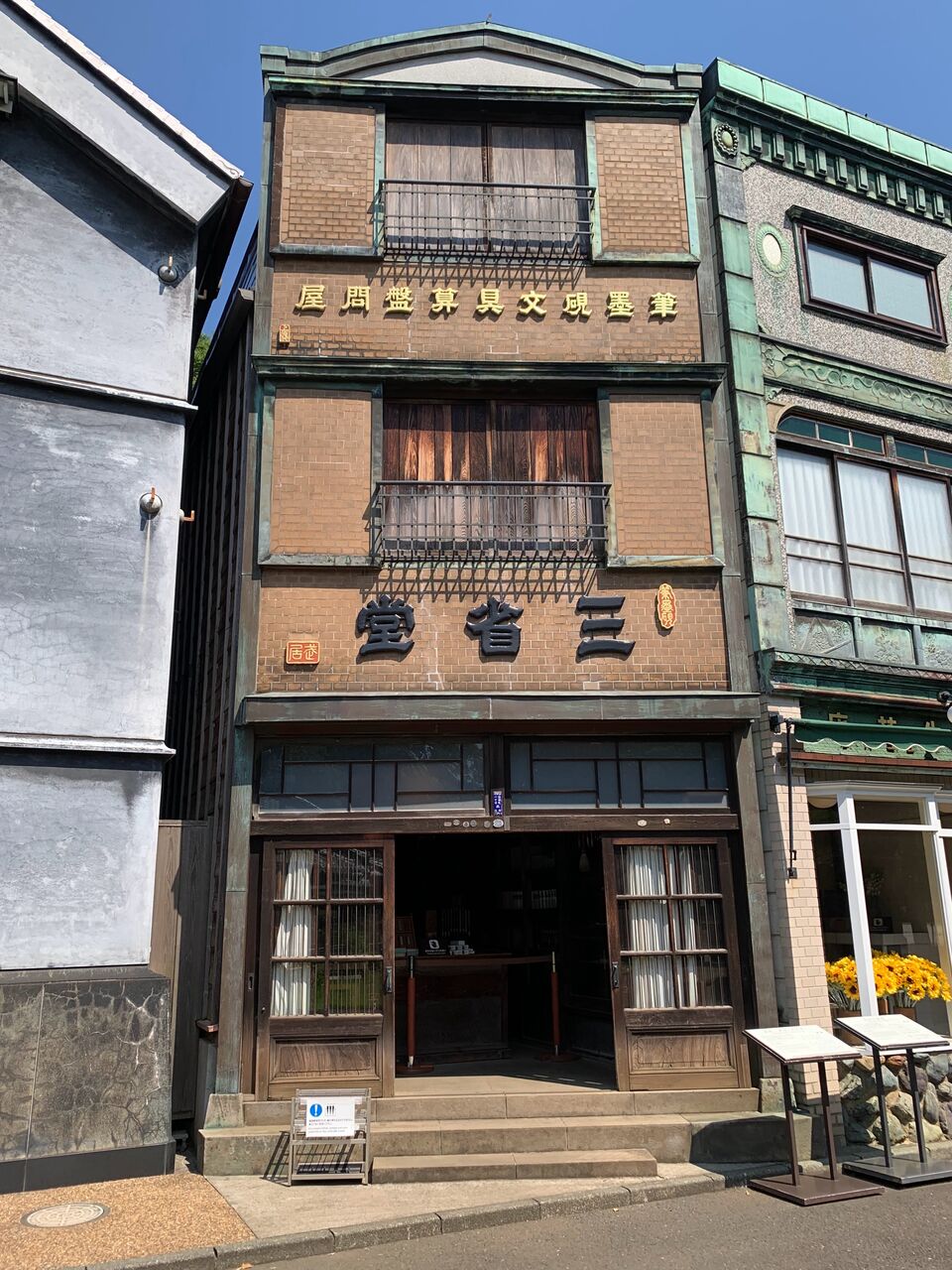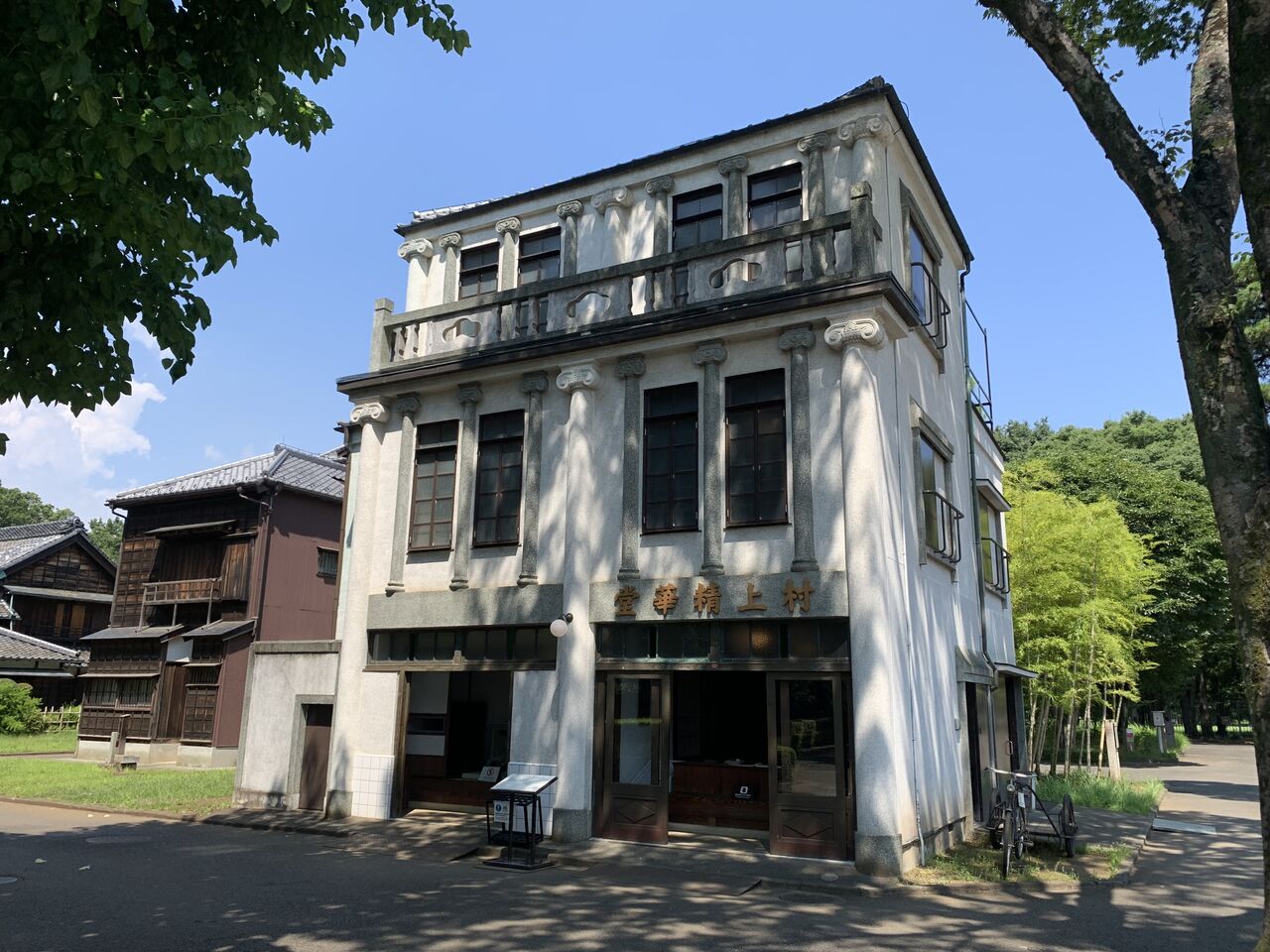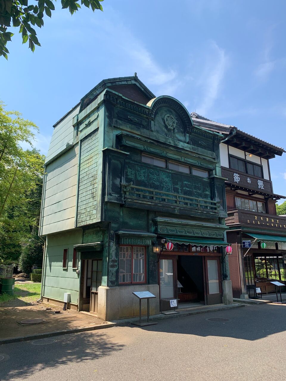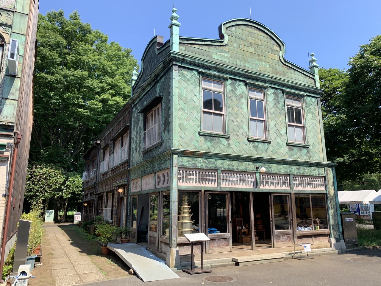 コの字型に建ち並ぶ建物を左側から。こちらは中央区新富町に昭和2年(1927年)建設された植村邸。銅板葺きの看板建築で、このような建物は下町に行けば現在でも僅かに残っていますね。なおこの建物の壁面には空襲の際、爆弾の破片などによる傷が多数残っているそうですが、なんと見逃してしまいました。