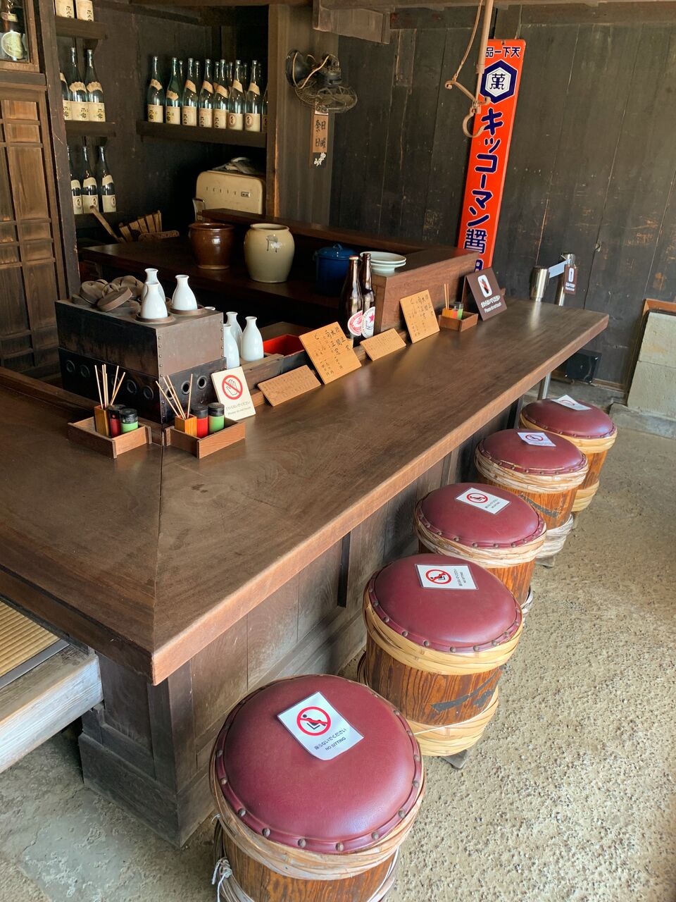 左手に座敷、コの字カウンターにヤマサ醤油樽の椅子。最初は酒問屋から創業し小売店となり、昭和に入ってから角打ちを始め、昭和24年(1949年)より居酒屋となったそうです。