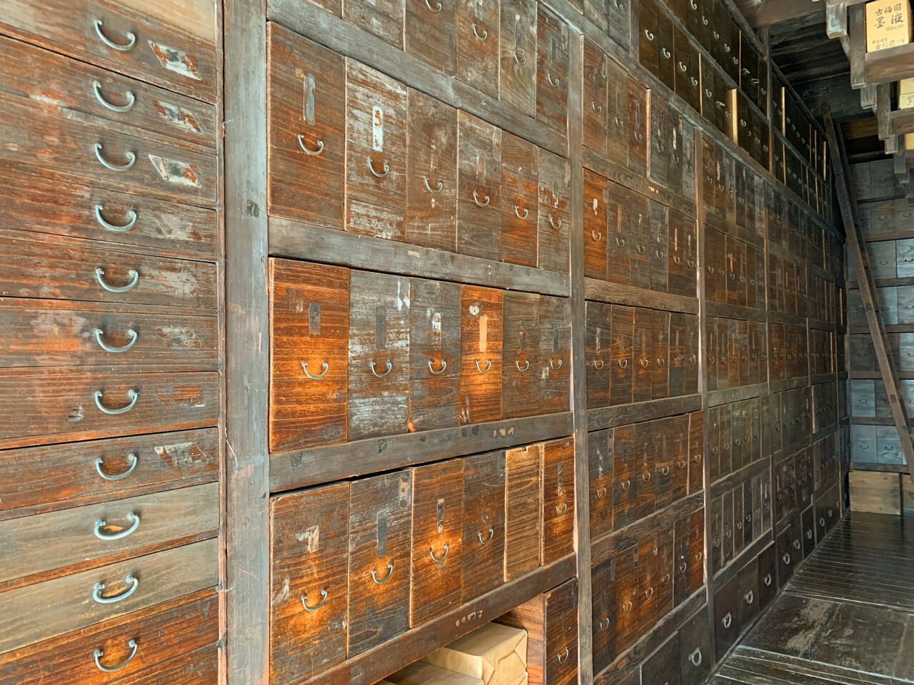 壁一面の引き出し。ジブリの「千と千尋の神隠し」に出てくる釜爺の部屋のモデルとなったと言われています。