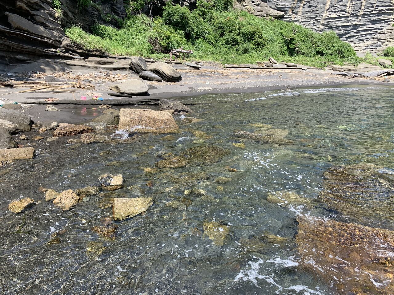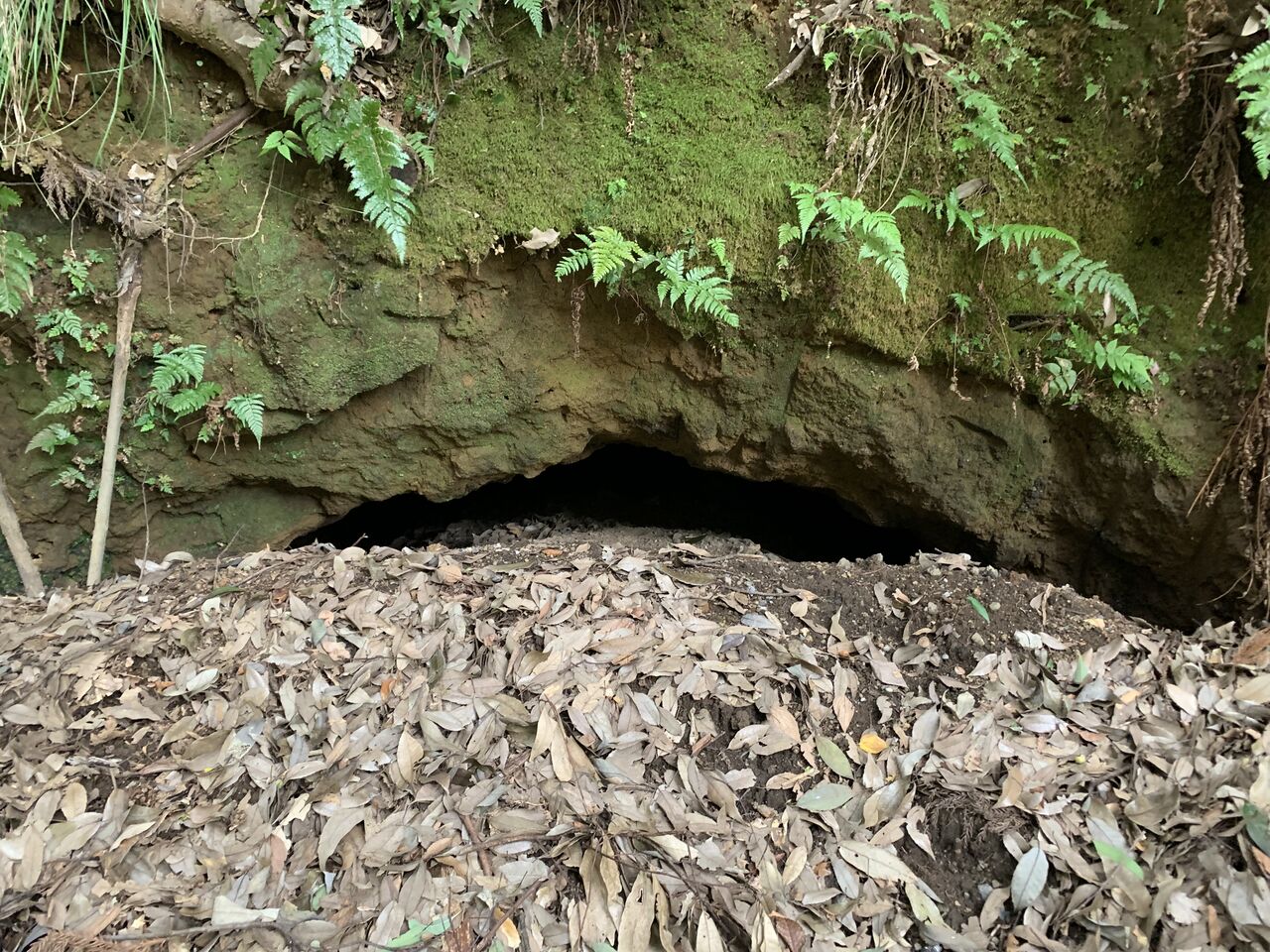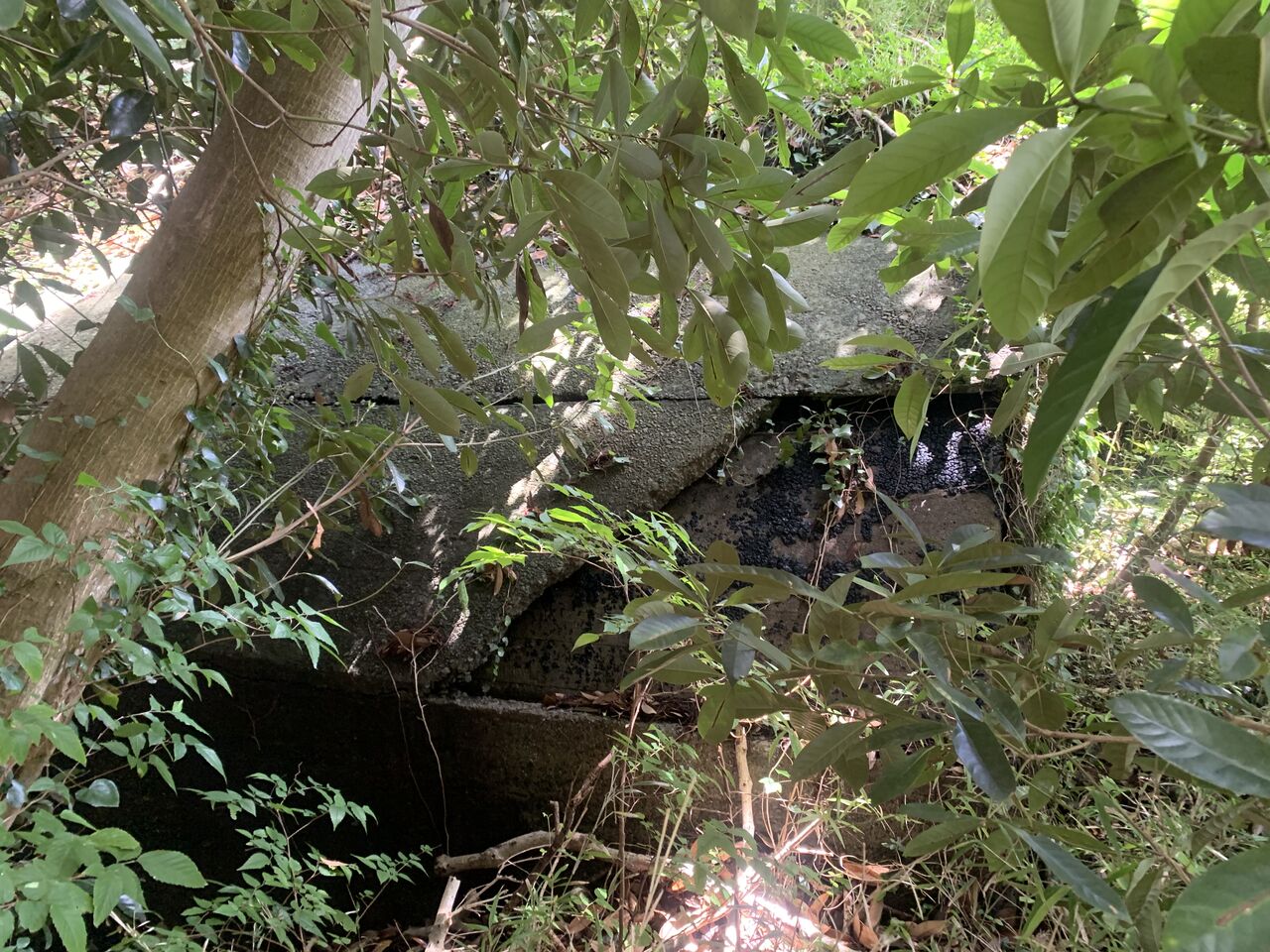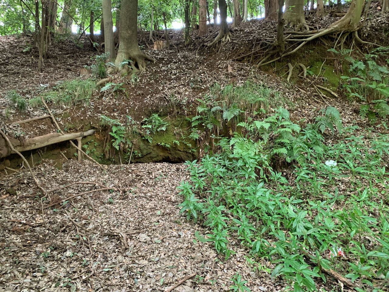 さて、ここからが本題。谷の西側斜面に、高座海軍工廠中丸地下地下工場の跡があります。早速それらしき痕跡を発見。