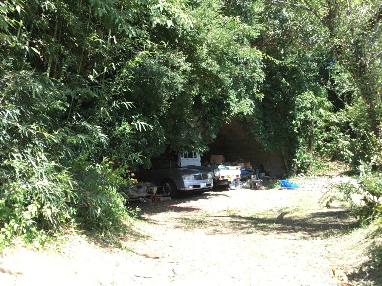 こちらも木々に覆われて形が分からなくなっている掩体壕。車庫として使われているようです。