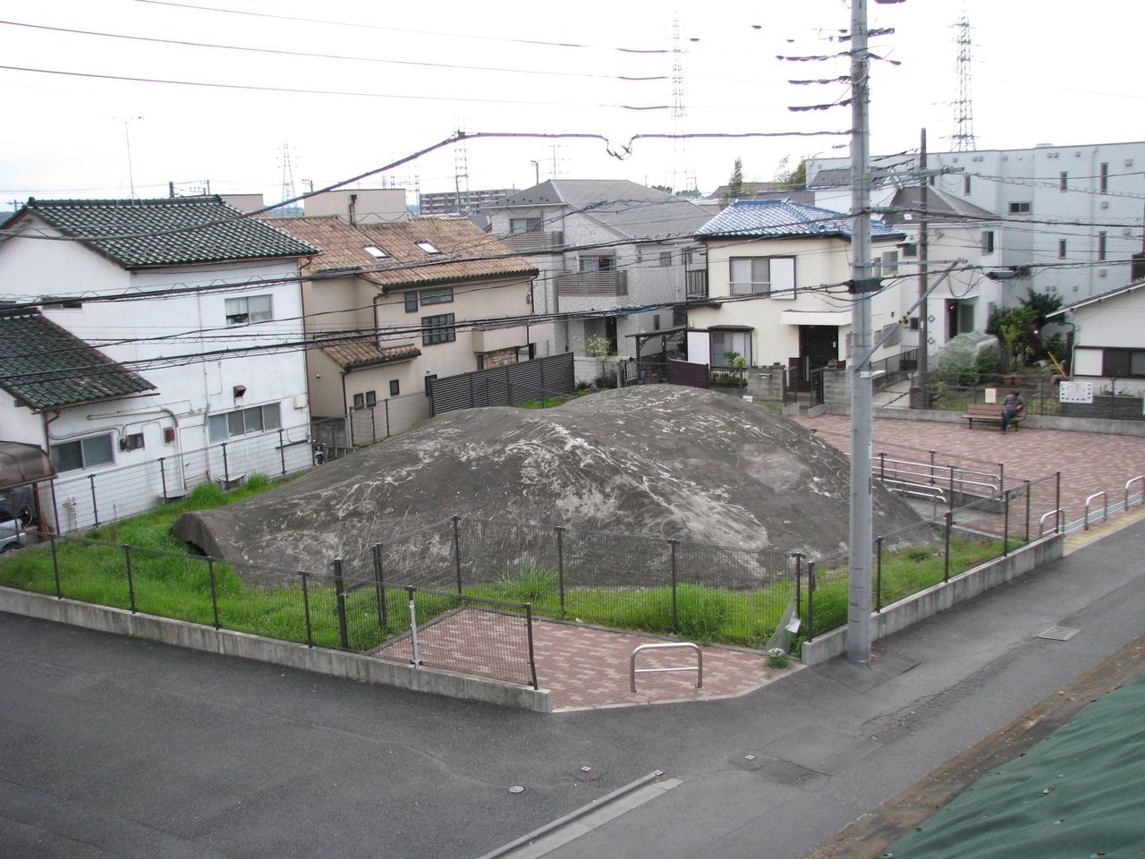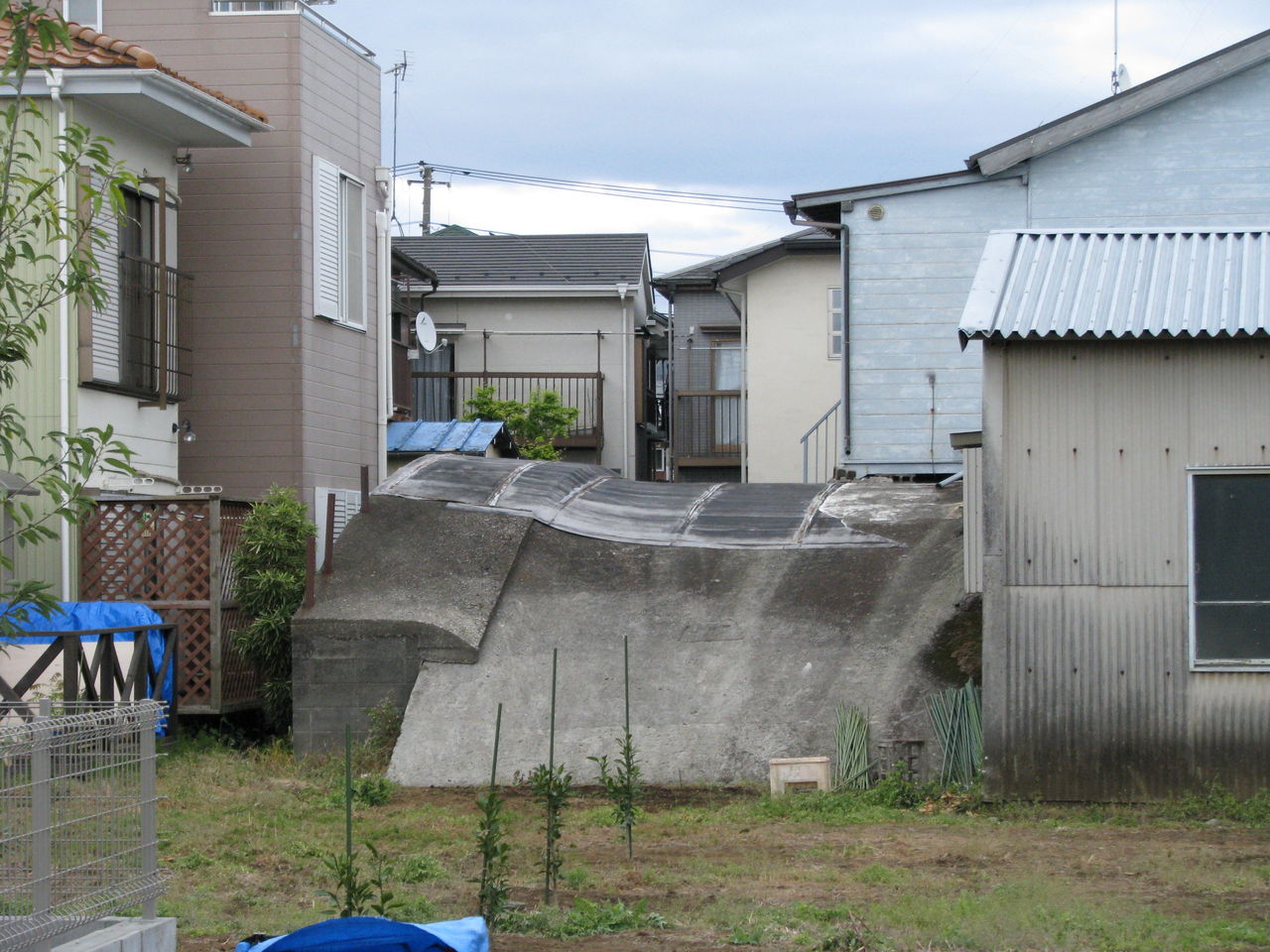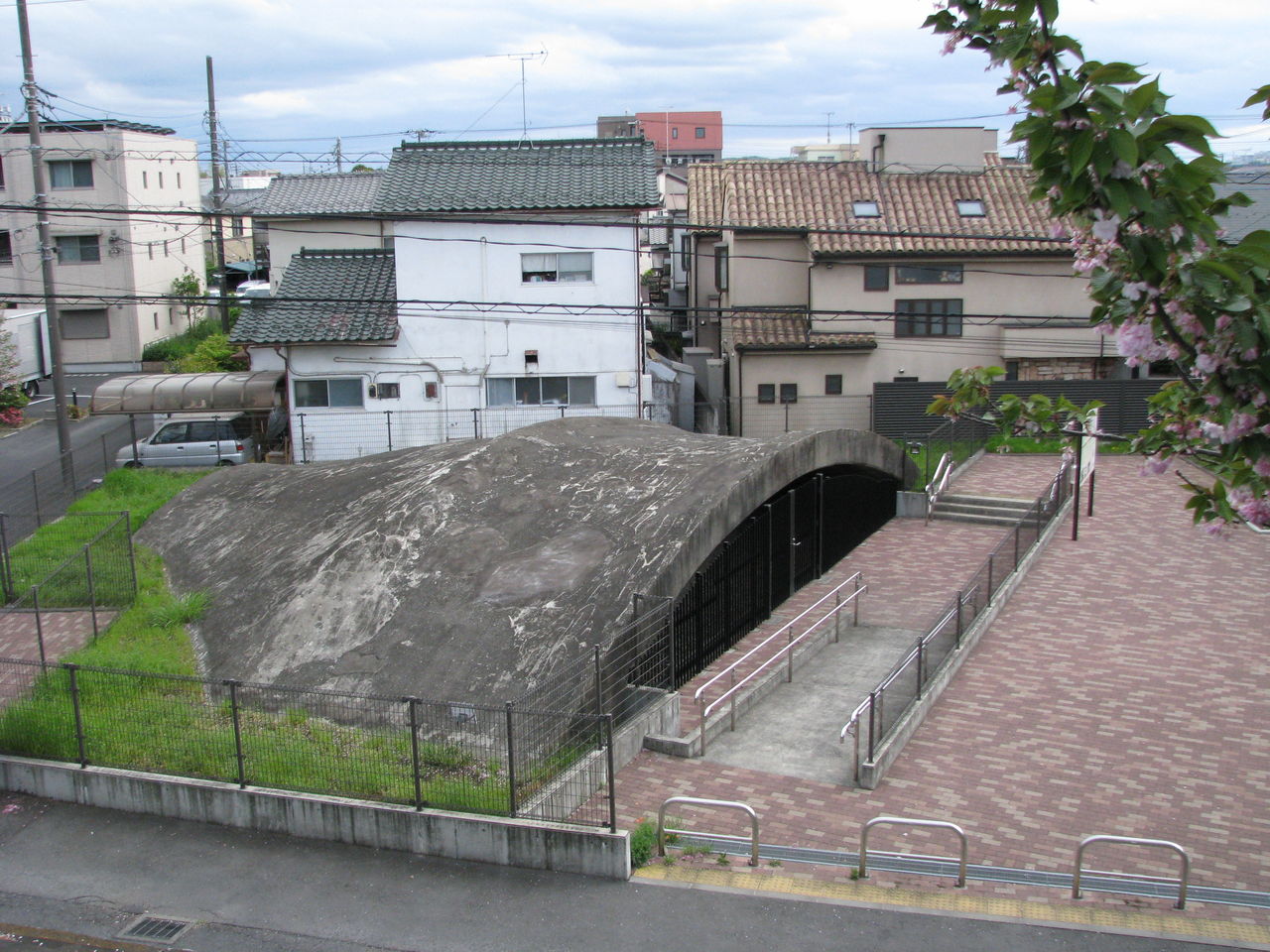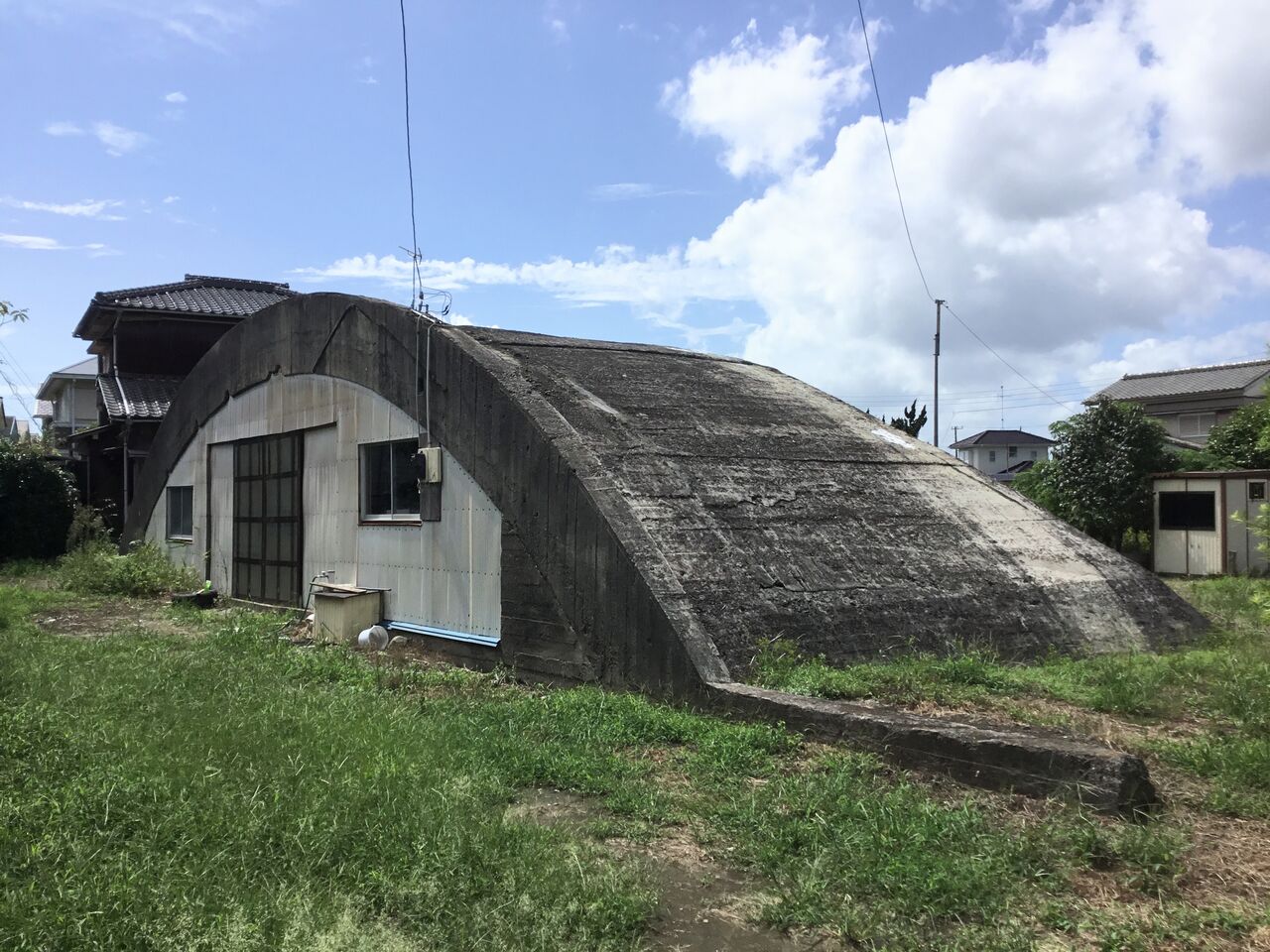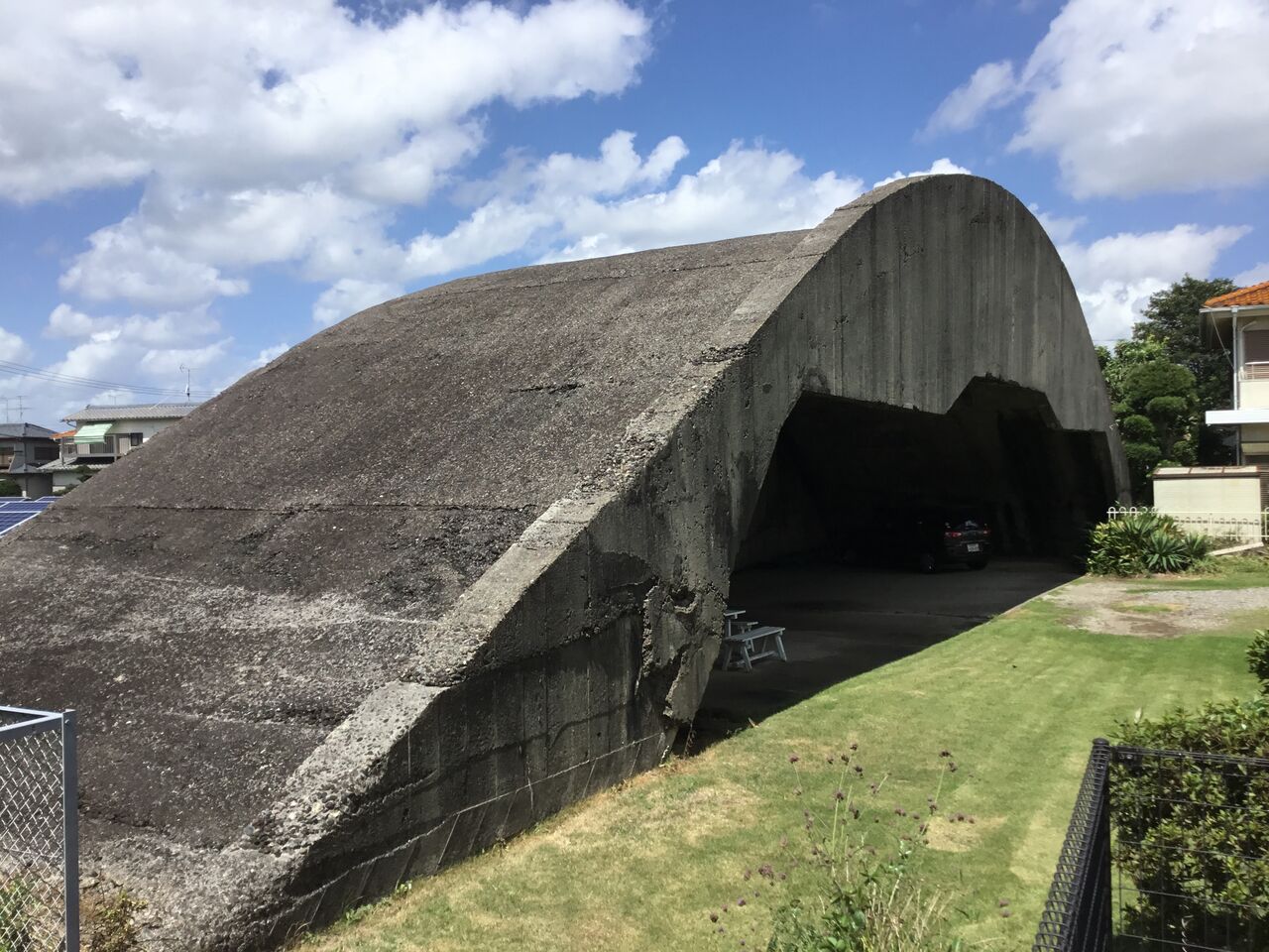 こちらは完全に私有地ですが、隣接するアパートの敷地から見ることが出来ます。掩体壕は頑丈に造られているため解体するにも費用が掛かります。そのため倉庫や車庫として使われている事が多いです。