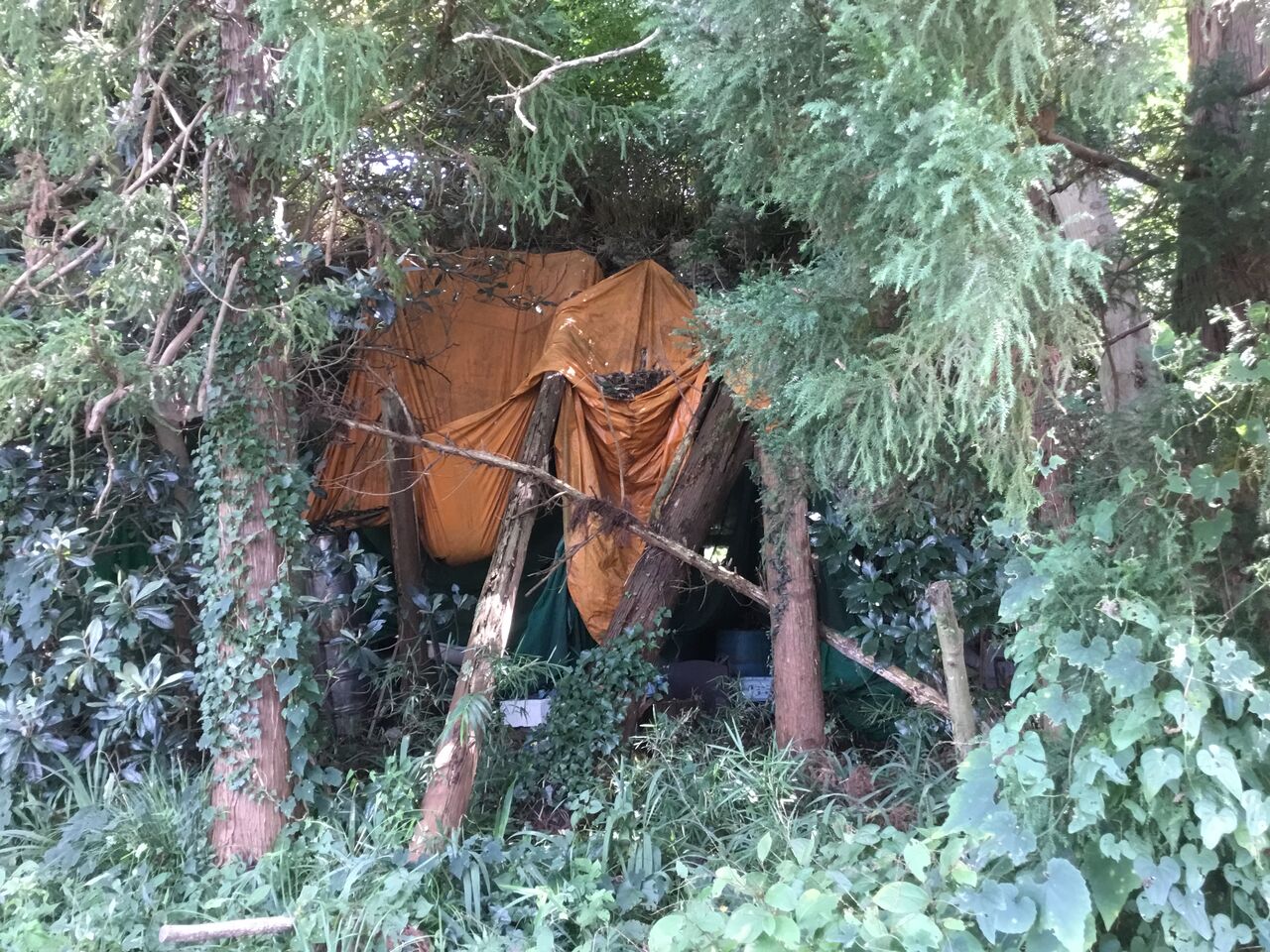 住宅街の中の森で覆われた掩体壕。ほとんど自然に帰そうとしています。