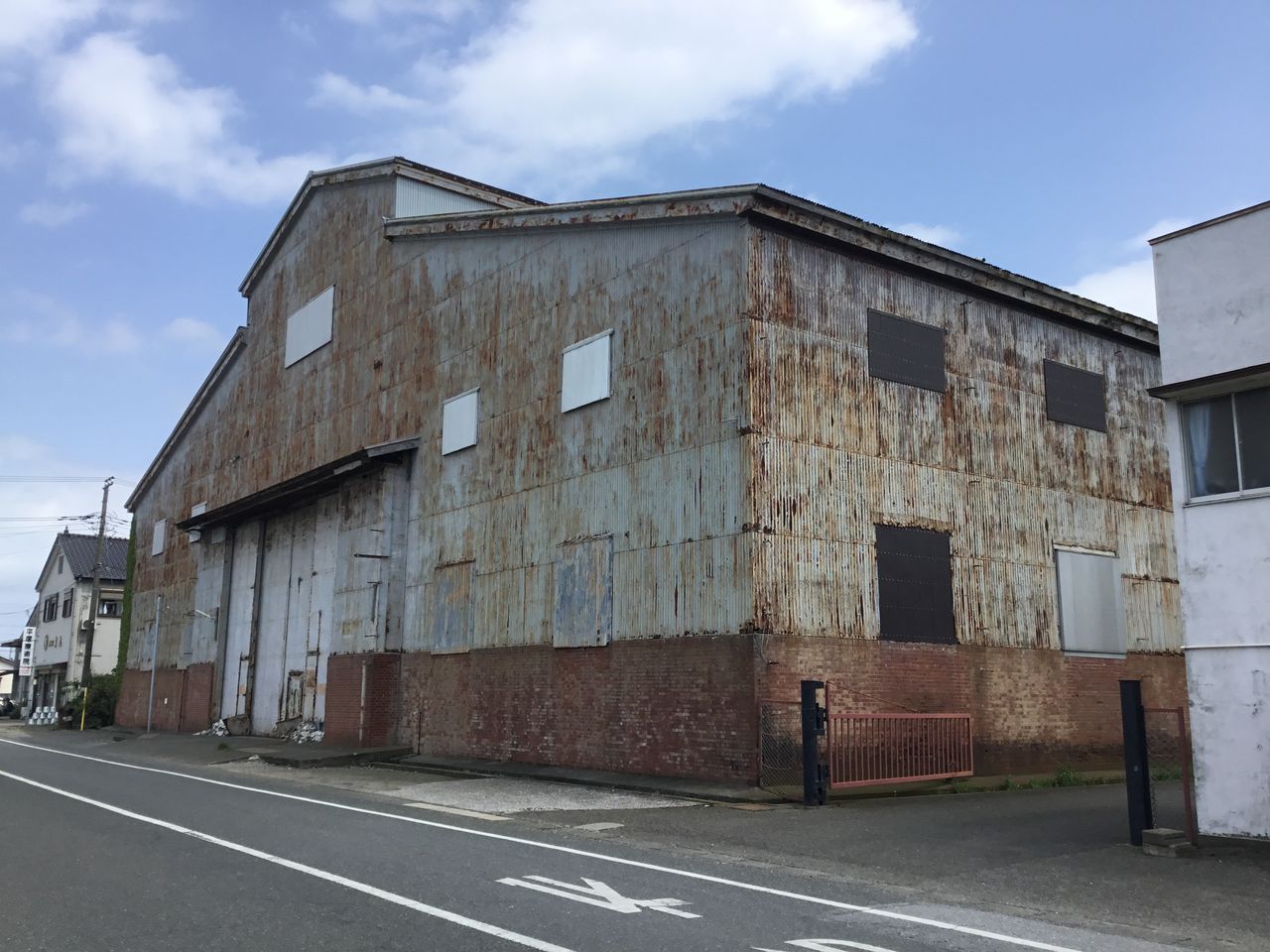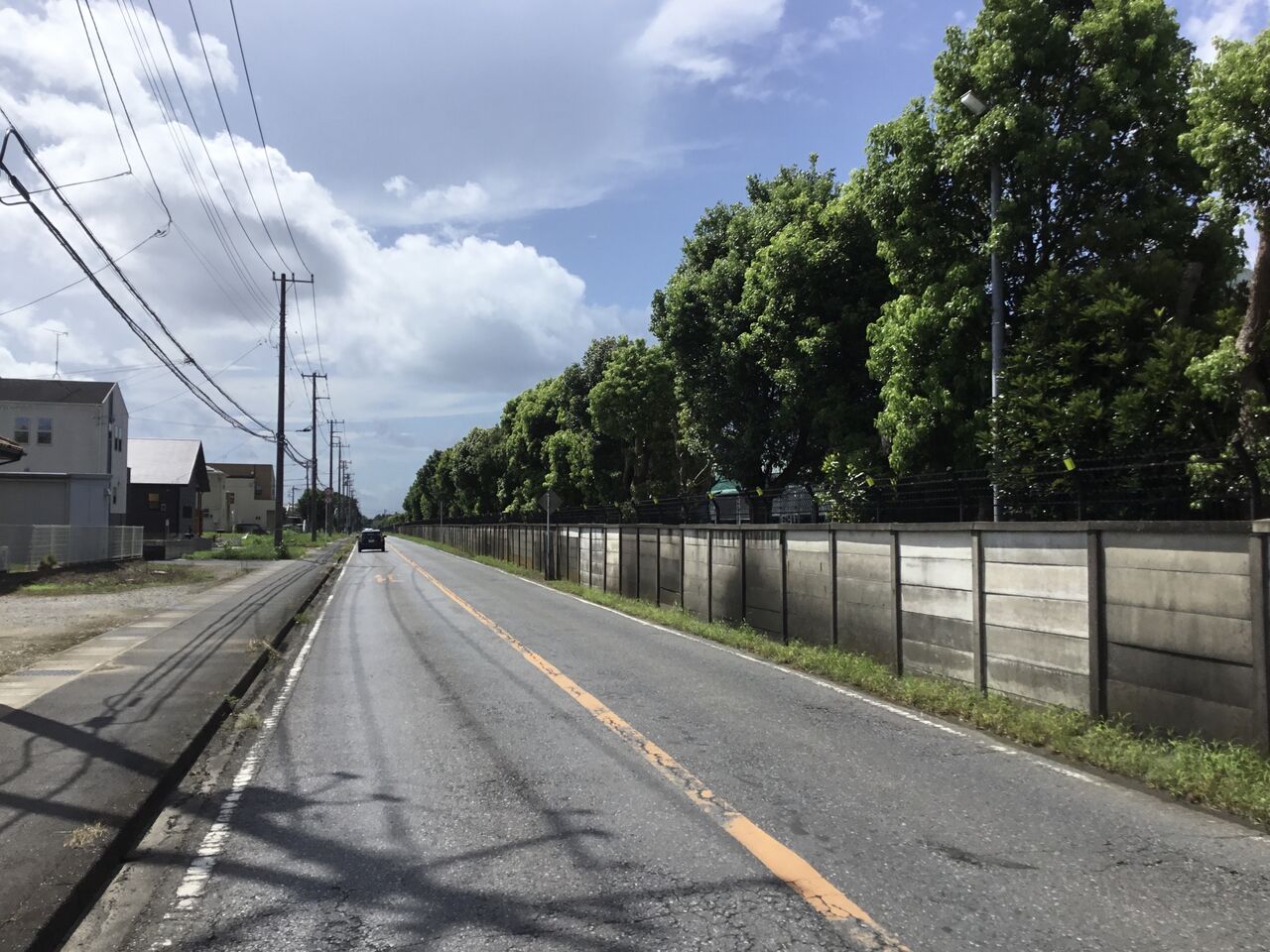 かつての滑走路跡。右手には三井化学の工場が広がっています。飛行場建設が決定したのは昭和16年7月。ここ東郷地区の住民約150世帯及び、東郷小学校や寺社ならびに墓地等が安い売却額で強制移転を命じられました。