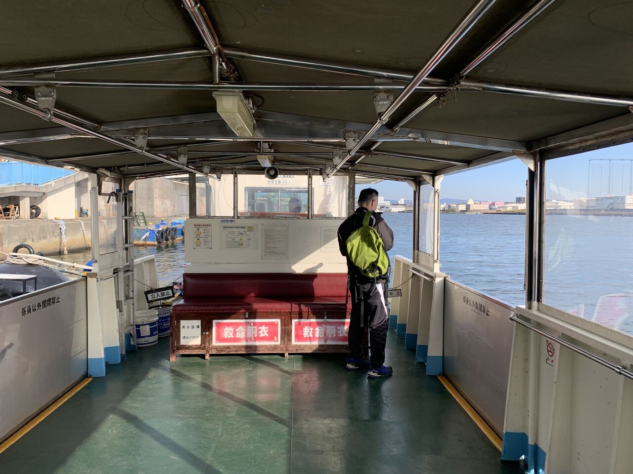 あ、また黄緑リュックのおっちゃんが!同じルートで渡船巡りしている人がいるようです。大阪港は明治大正期まではもっと内陸の、淀川沿いの方まで広がっており、今よりもっと多くの渡船が存在したそうです。