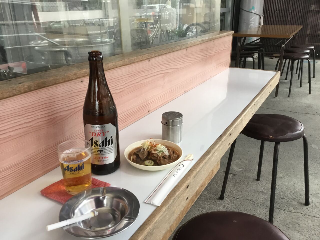 最終レースは居酒屋の中継で観ようかと思い、舟券を握りしめてもう一軒の居酒屋「竹の子」さんへ。こちらも店内禁煙、店外のテーブルは喫煙可。