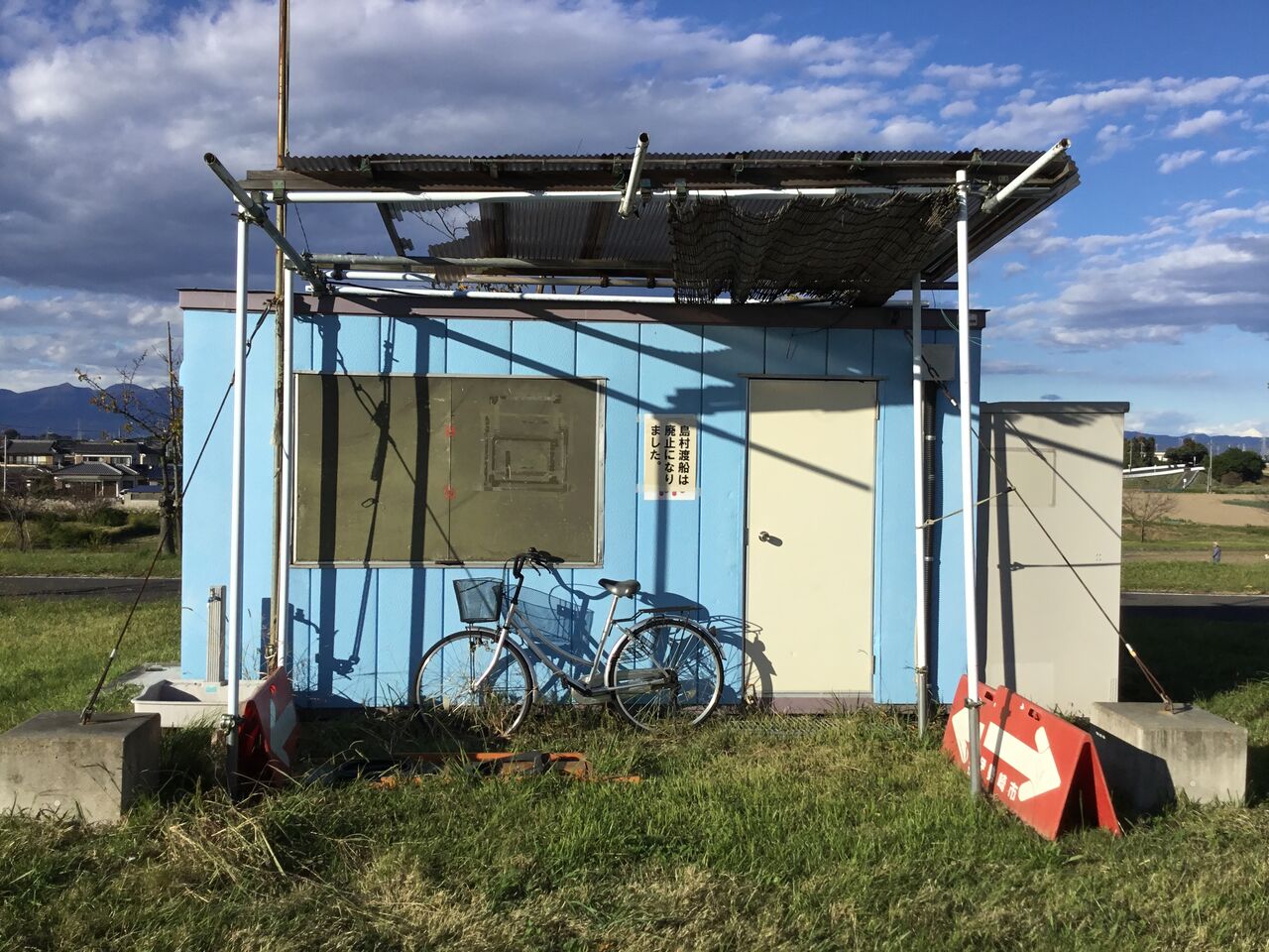 島村から下流側に3キロ行った所に掛かる上武大橋を渡り、島村渡船の境町側船着き場へと来ました。土手の上にポツンと残るほったて小屋が、かつての船頭の詰め所です。