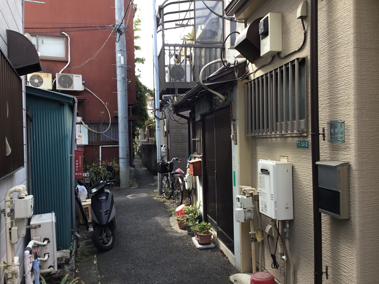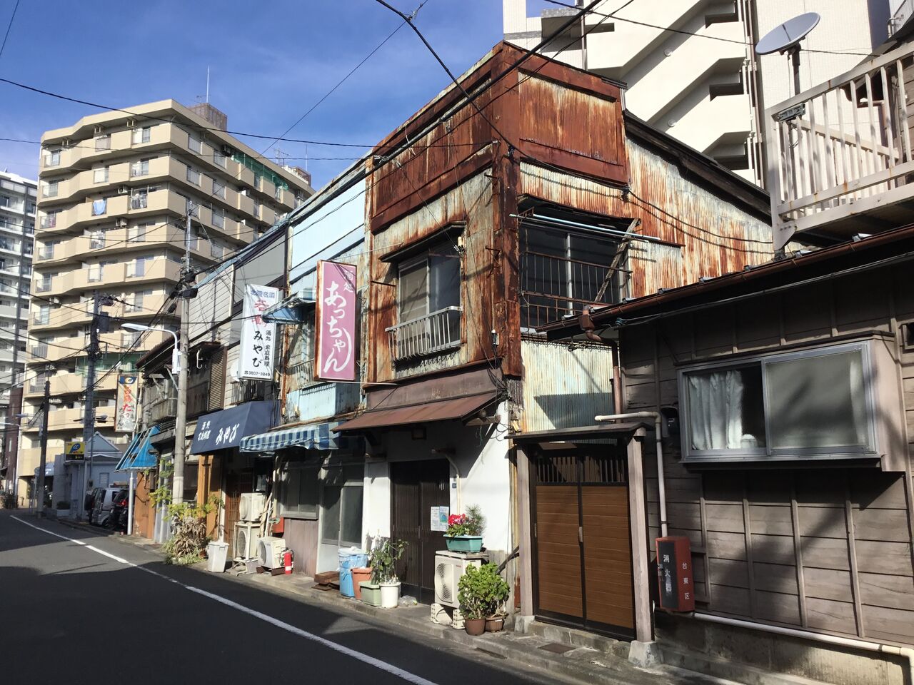 屋根の低いバラック住宅は地方に行けば今でもよく目にします。ただ都内の路地の決定的な違いは必ずアスファルト舗装されているところ。どんなに狭い路地でも舗装されているんですよね。